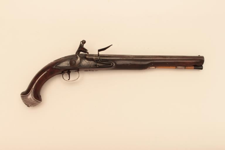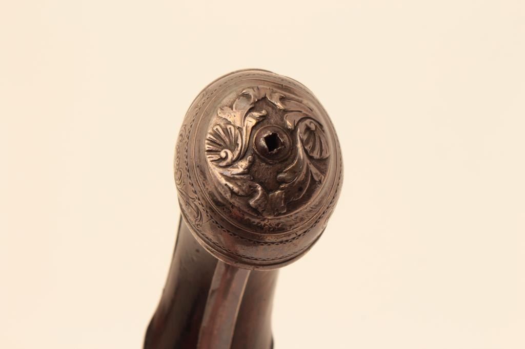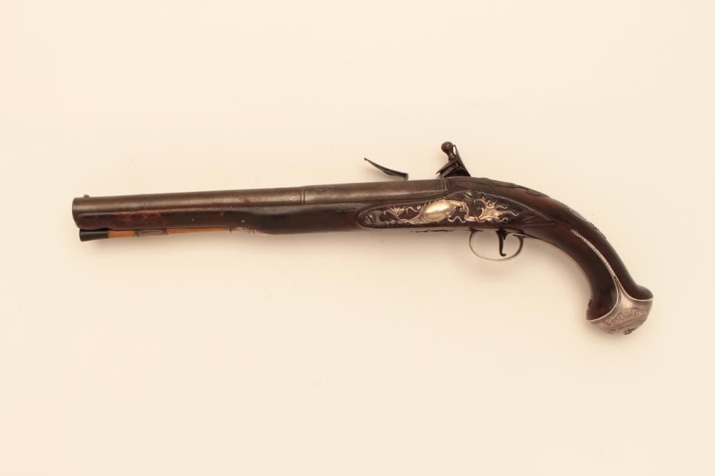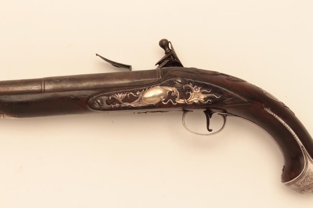 Fine Quality Georgian style Flintlock Pistol by Thorpe with Silver mounts circa 1760-1780's in French and Indian War to Revolutionary Era. 17 1/2" overall with 11" bbl of approx. .62 cal. smoothbore. Finesilver mounts with pierced and scrolled side plate showing matching motiffs on mountings. The butt cap screw is replaced. Original flintlock with correct small parts and very good overall condition. The silver plaque inwrist shows English Lion holding jousting lance. An elegant pistol with superior length and form. Est:$2000 4000