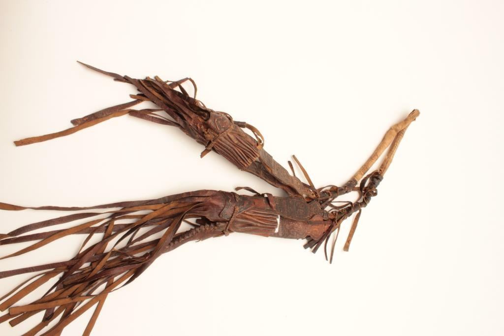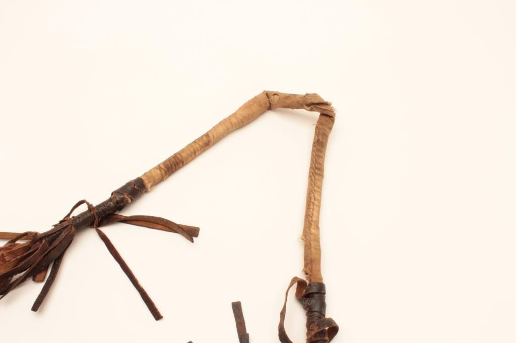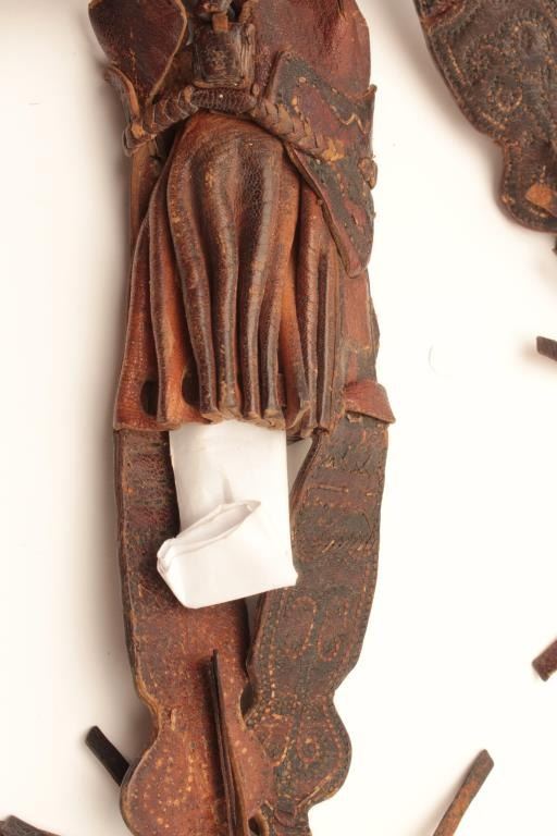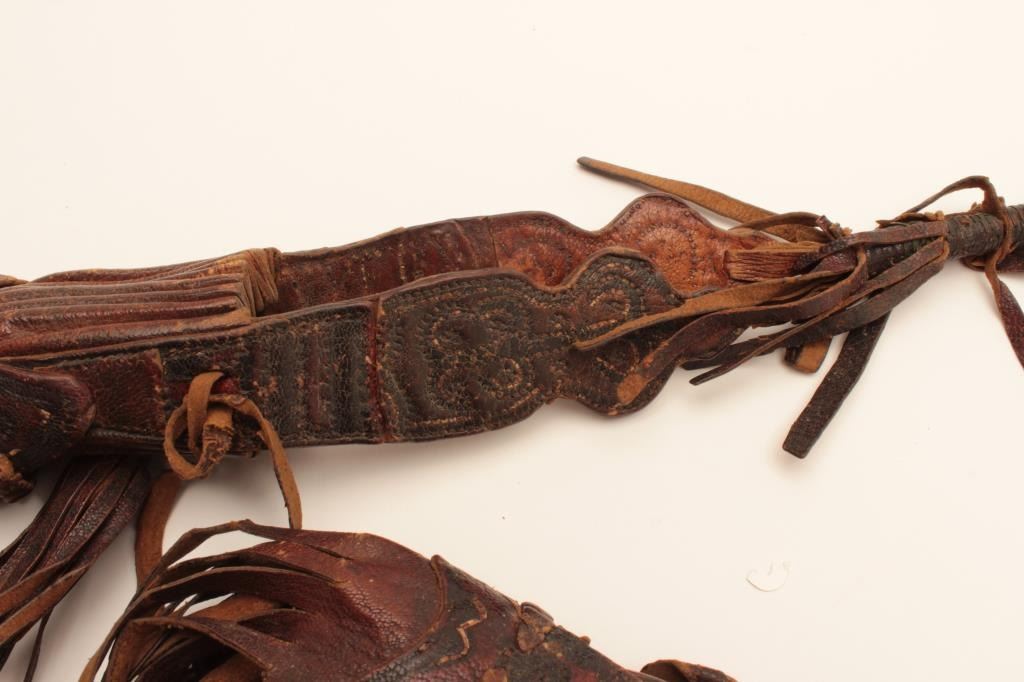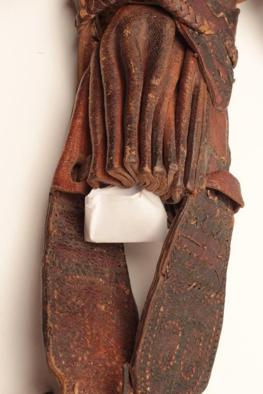 Spanish Colonial Army 18th to early 19th century cartouche for holding linen. Made of leather with long fringe, painted and embroidered in simple decorative design. Each side has 10 folds with expansion appear tohave held 10 large size charges for musket in each of the two pouches. Would have hung from belt or over a saddle. Approximately 60” from end to end when stretched out. Minor deterioration and flaking to leather but very good for its age. Out of a museum type collection recently found in France. (See Es Copeta Musket prior lot as they could have been carried together) Est: $400-$800