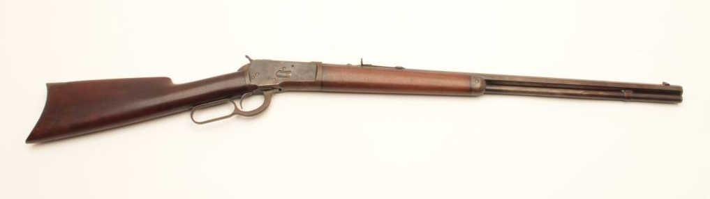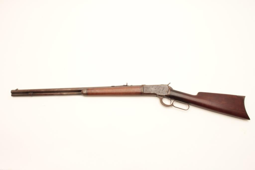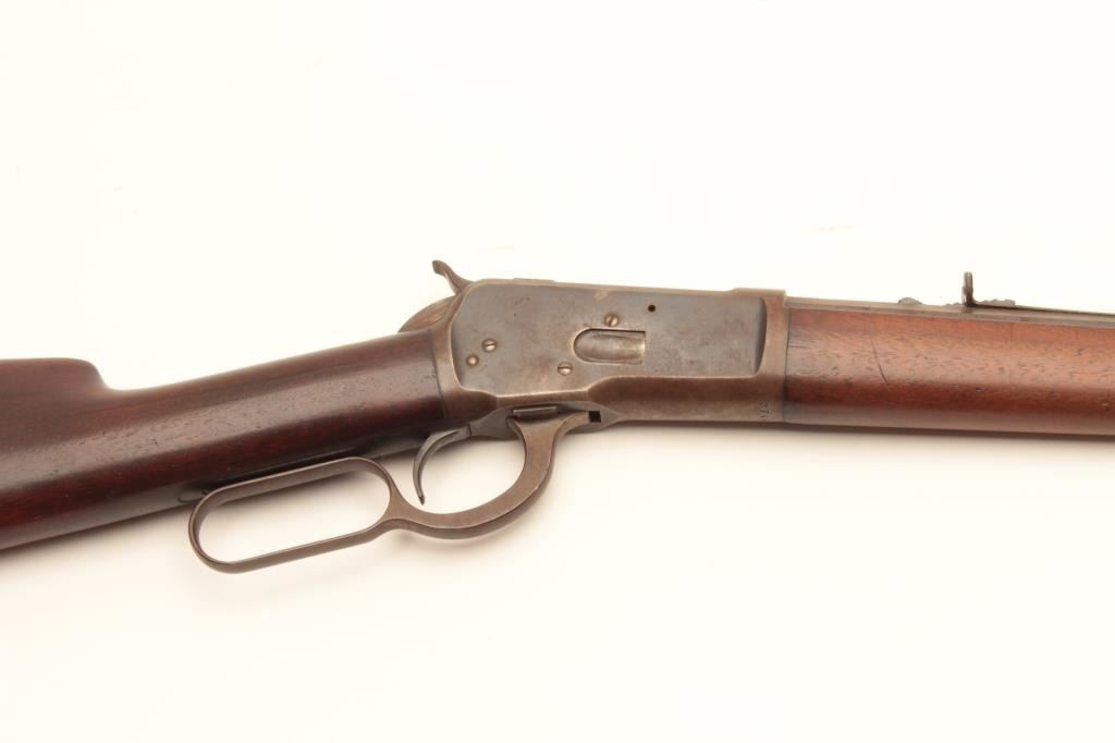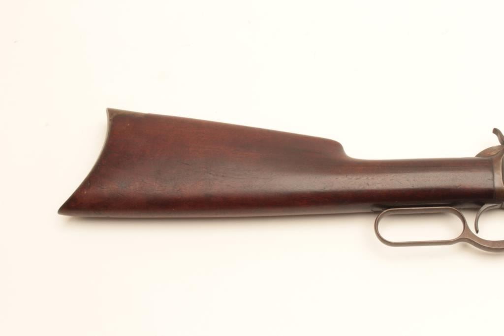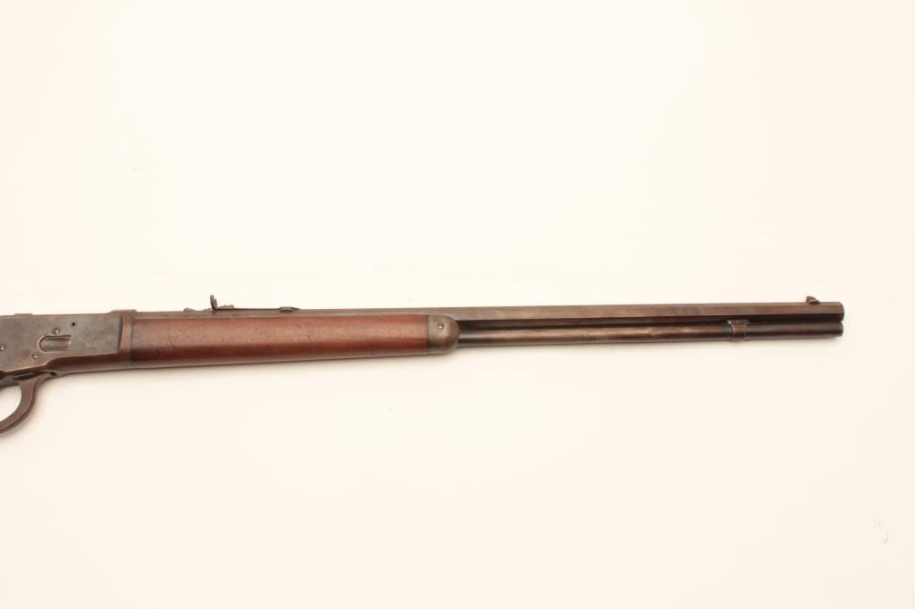 Winchester Model 1892 Rifle in 25-20 Cal with 24” octagon barrel, full mag, rifle butt #374450. Very good condition with 30%-50% blue mixed with uncleaned natural patina. Markings are good, crisp edges, very goodstocks with excellent fit. Bore is fair to good and may clean. Action sound and tight. Period added Blackhorn sight in factory dovetail. A nice uncleaned Winchester from an estate.Est: $800-$1,600