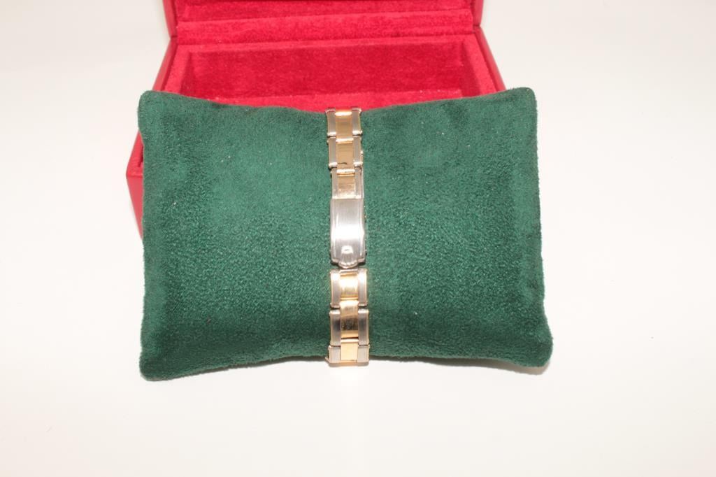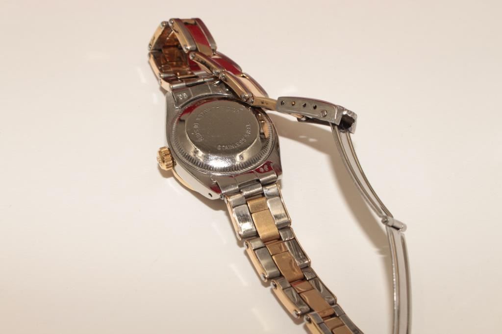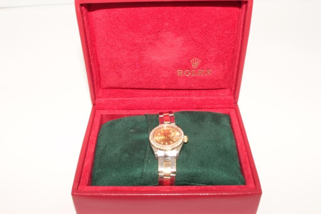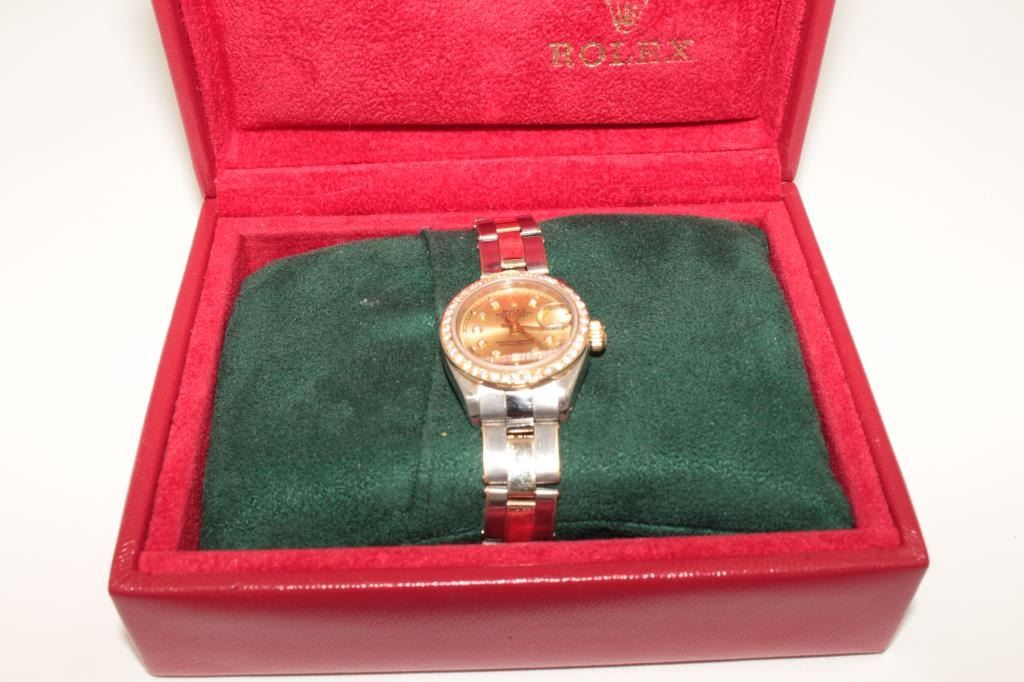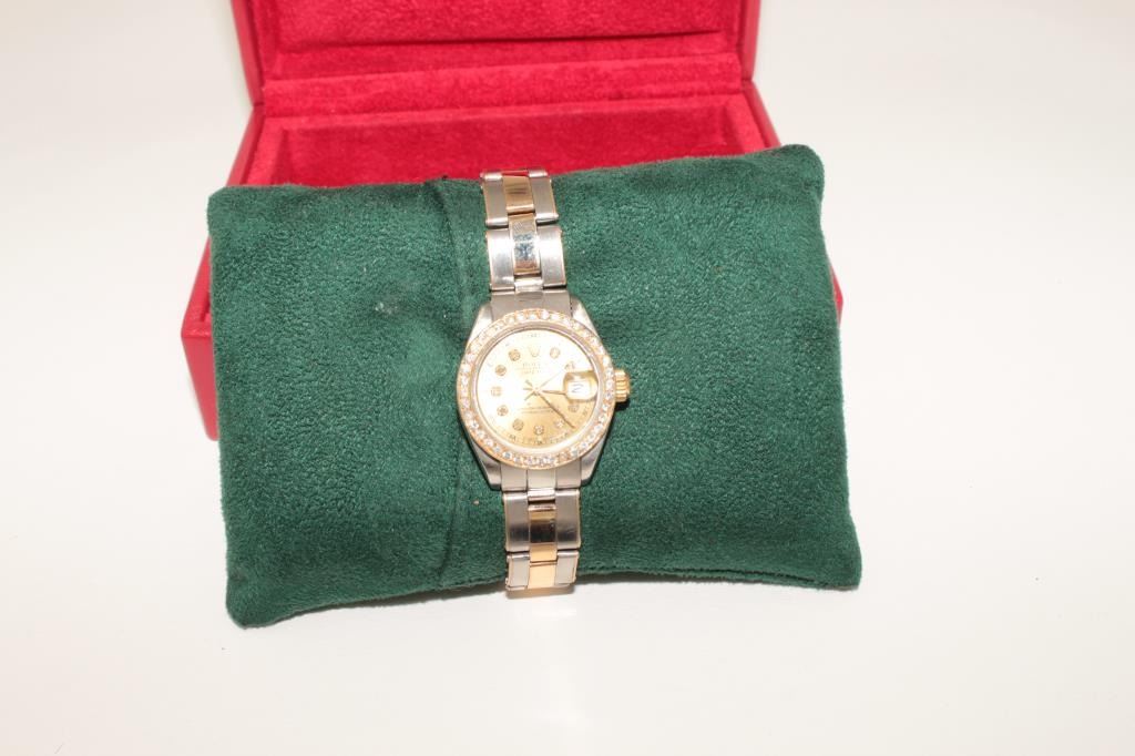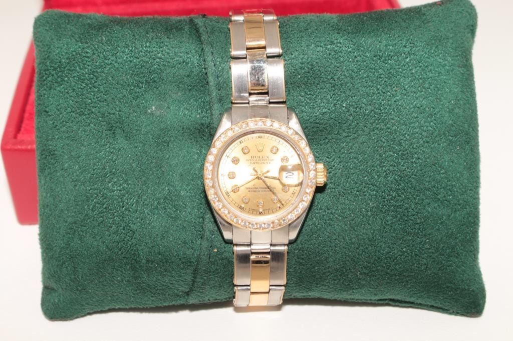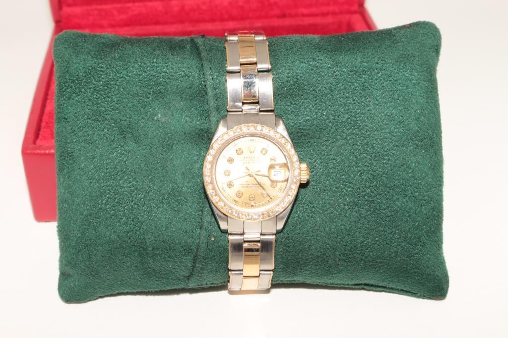 Vintage ladies gold and stainless ladies wristwatch with custom diamond dial and bezel. Recently cleaned and repaired in Rolex box. Est:$2000-4000