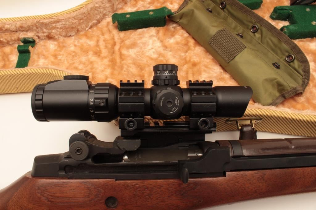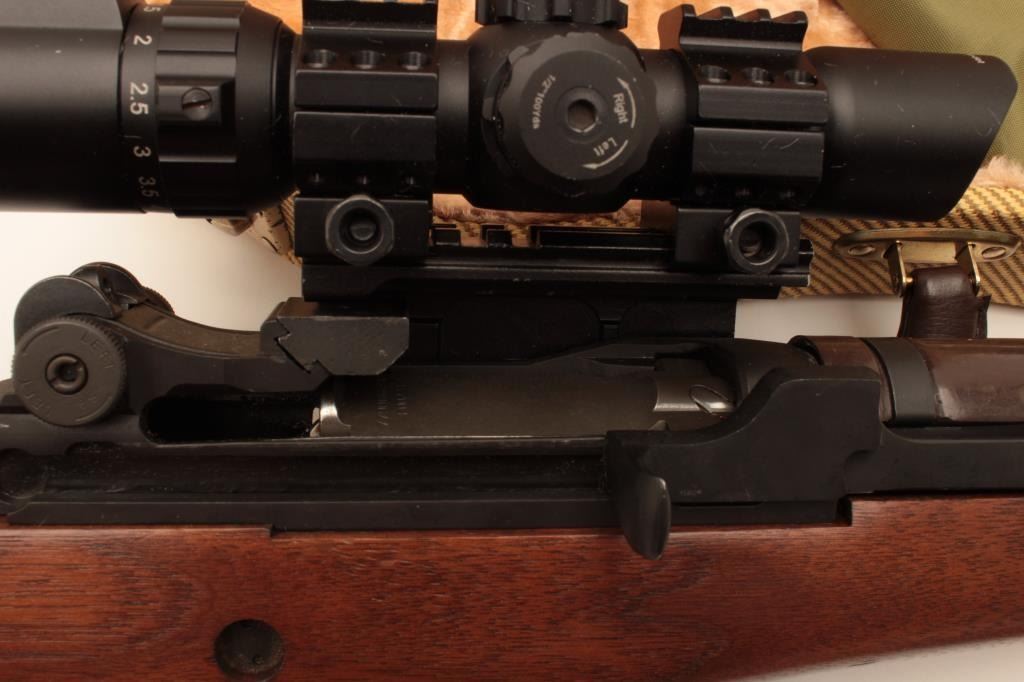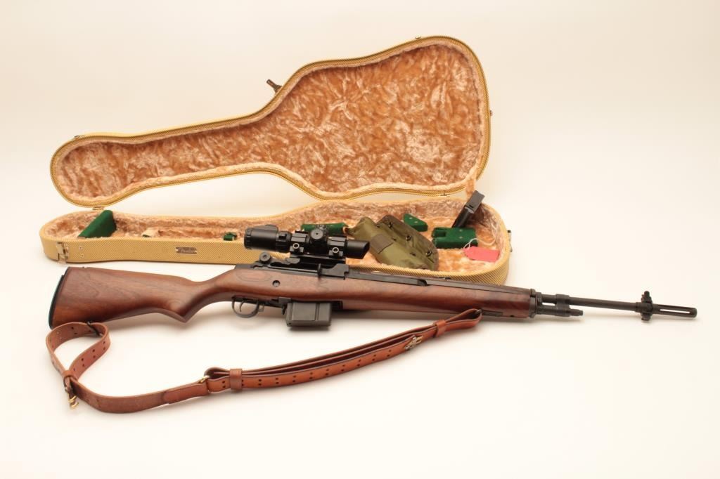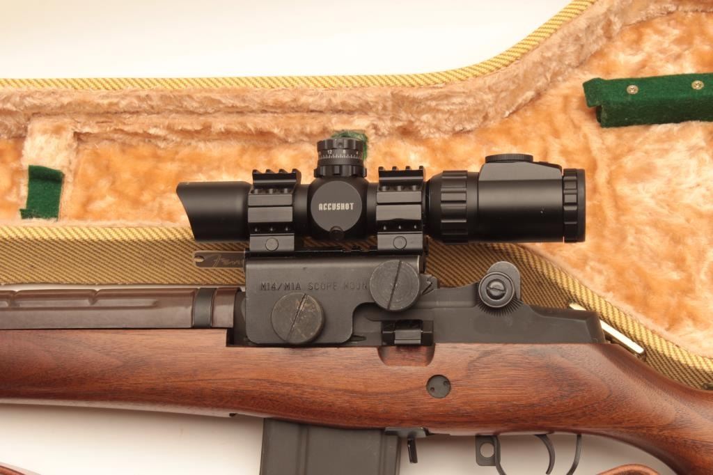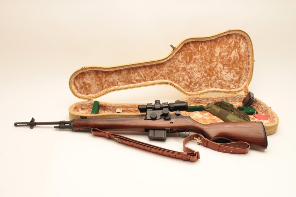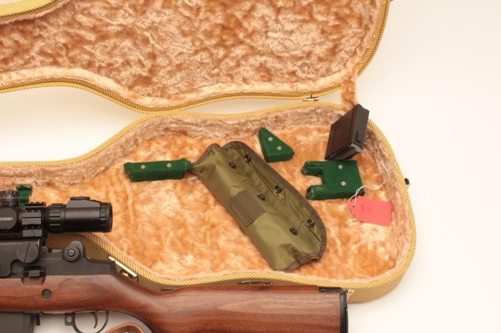 M1-A 308 caliber semi-automatic rifle by New Springfield Armory lighted variable tactical sniper grade scope and custom carry case. One 10 round magazine. Leather sling. Fine to excellent used condition. #270561.Est: $1,000-$2,000