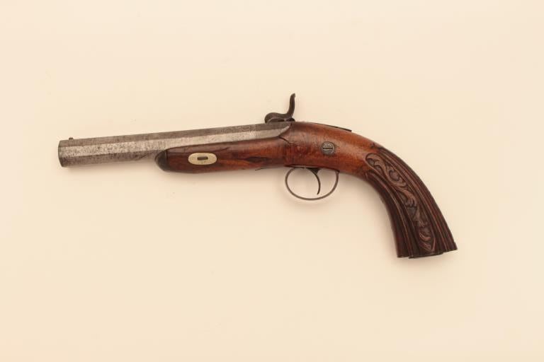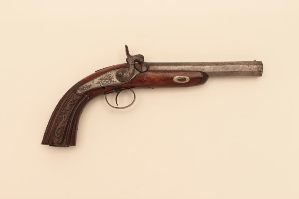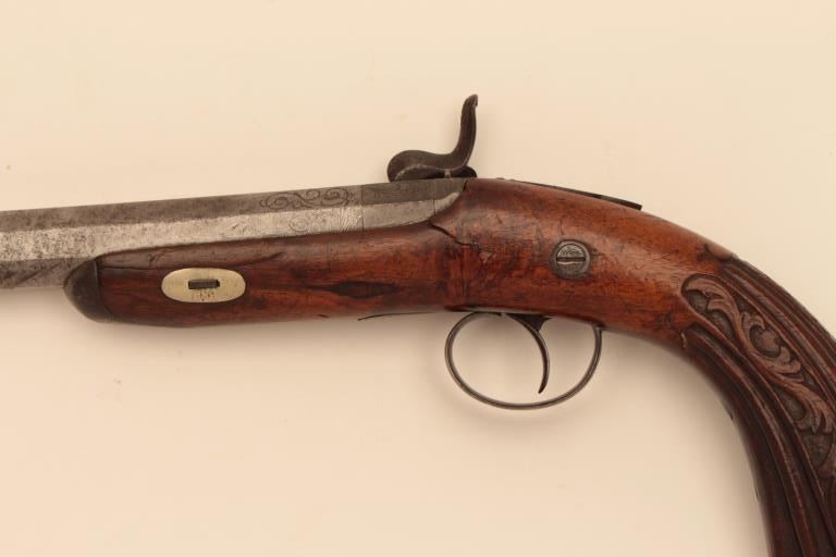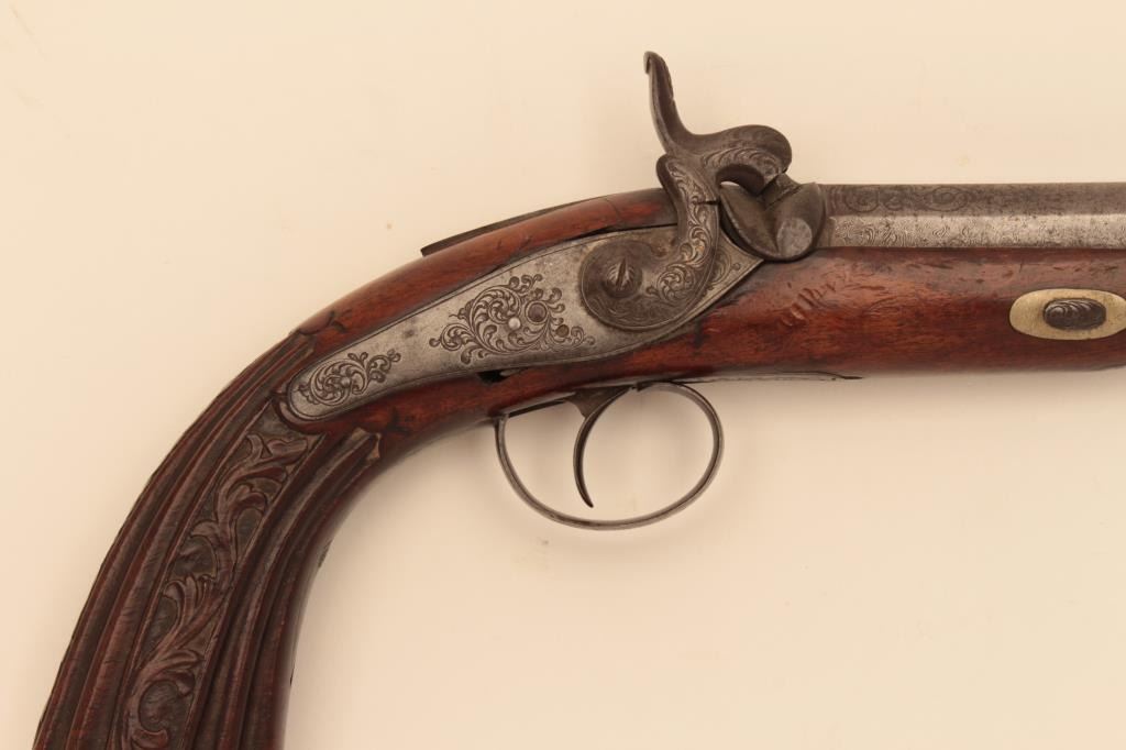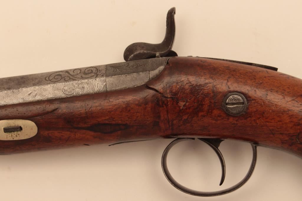 Central European Dueling or Target style pistol inlaid in silver Cannon Damas A1 Aciger in French on barrel, (Damascus Steel). Back action lock circa 1850’s to 1860’s. 14” overall with 7 ¼” octagon barrel of 80 pluscaliber false rifled. Nicely raised carved stock and engraved lock and mounts. Crack at the neck of the hammer. Missing ramrod. Cap box in butt. Est: $500-$1,000