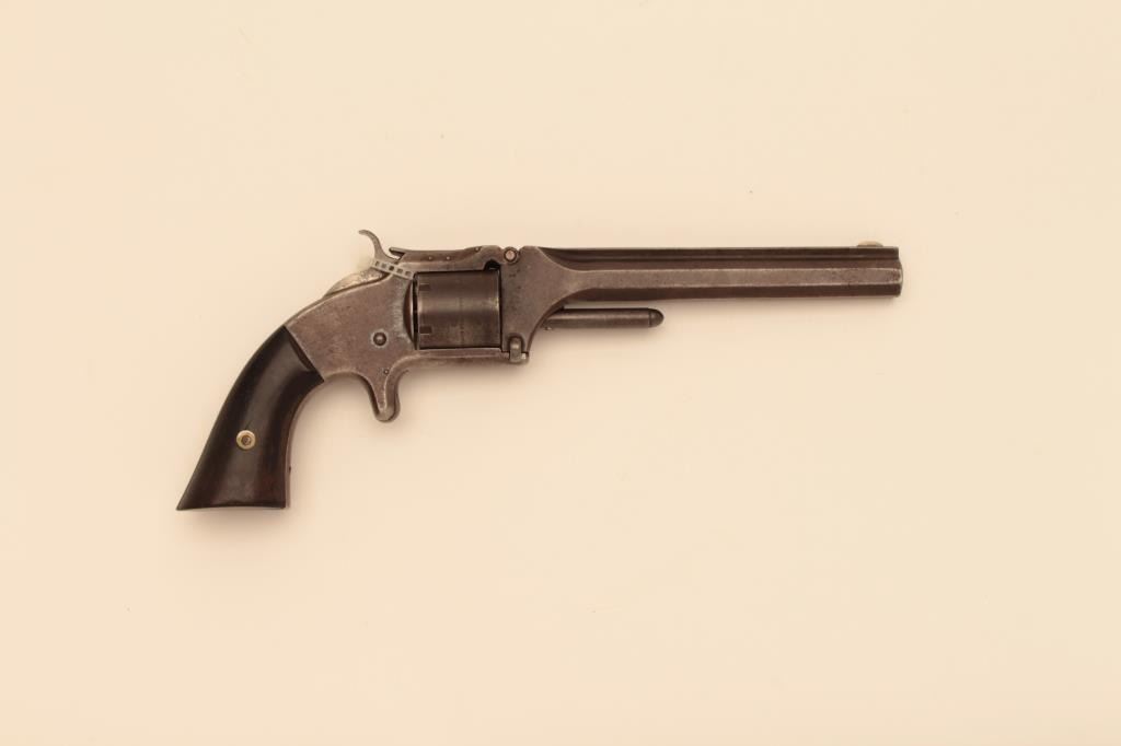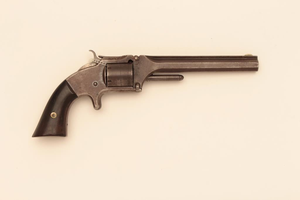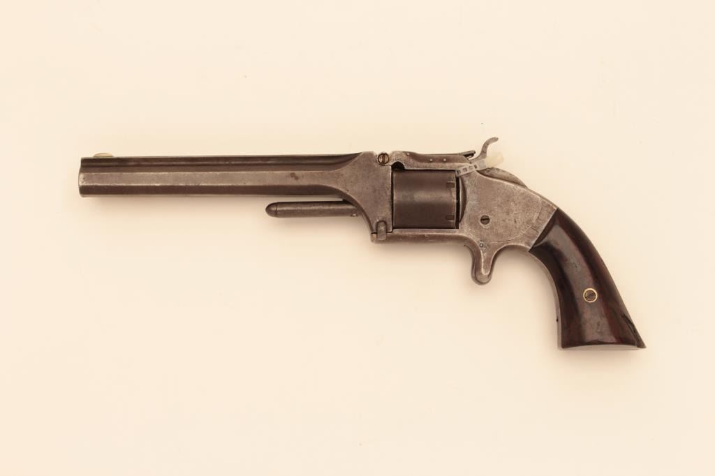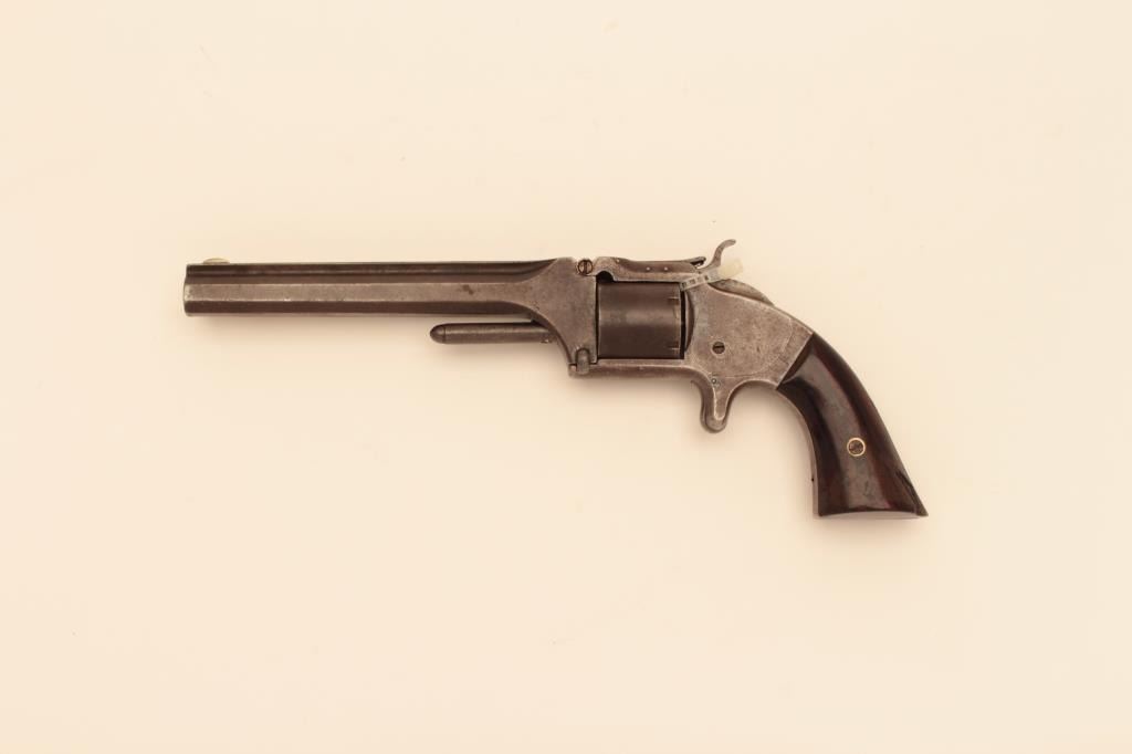 Smith and Wesson #2 Army in .32 caliber. Rimfire revolver #15245 near range sold to Kentucky during the Civil War. Early 3 pin variation. Good to very good condition with traces of original blue mixed with brownpatina. Rosewood grips, good other than large chip from left heel. Some peening around latch screw and ejector to tighten during use. Lettering mostly visible. Action good and bore is fair.Est: $500-$1,000