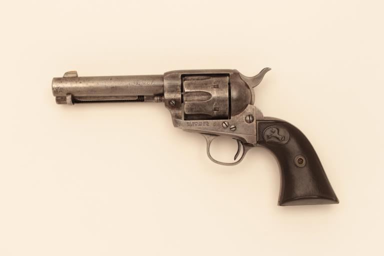 Colt SAA revolver, .32 W.C.F. cal., 4-3/4” barrel, blue and case hardened finish, checkered hard rubber grips, #262006 in overall good condition showing an old cleaning that is returning to a light grey patina with scattered areas of erosion, wear and pinprick pitting, crisp action, fair bore, good markings and worn but complete grips; front sight has been modified with a brass bead. Factory letter confirms features and indicates the weapon was shipped to Simmons Hardware Co., St. Louis, Mo. on January 10, 1905 in a shipment of 40 guns. Accompanying this lot is a signed letter, newspaper articles and a photo of the owner, Leonard A. Wright, stating that Wright was born in Albuquerque, NM in July 1887, that he came from a pioneer family from New Mexico and Texas, that he worked for some 60 years as a cowboy, rancher and periodic lawman. Leonard also reportedly witnessed the lynching of “Shotgun” Jim Miller, Joe Allen, BB Burrell and Jesse West at Ada, OK. In April 1909 for the murder of A.A. “Gus” Bobbitt. He additionally had previously be a member of the Booger Red’s Wild West show. In later years, Wright worked for the Phelps Dodge Mining Corp as a Security guard in Arizona before he died in Dec., 1951. A great sidearm of a true cowboy of the West. (C& R/PPT). NOTE+++ THIS WAS THE DESCRIPTION WHEN WE ORIGINALLY SOLD THIS GUN. THE PAPERWORK INCLUDING THE FACTORY LETTER WAS LOST BY THE CONSIGNOR. NO PAPERWORK INCLUDED IN THIS LOT. Est.: $3,000-$5,000.