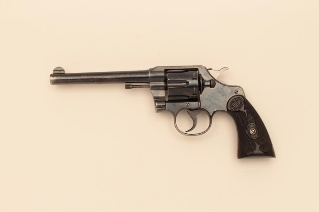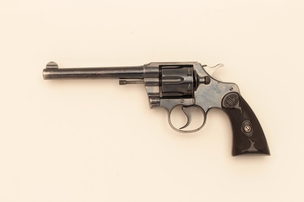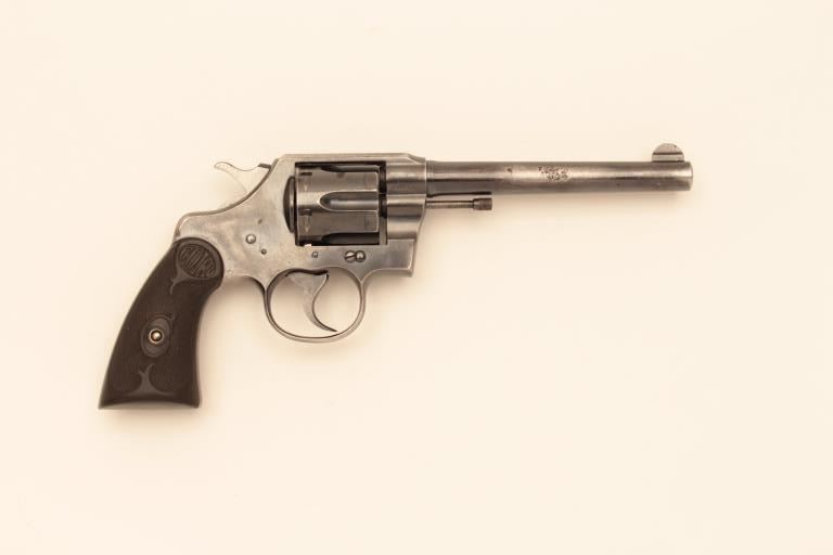 Colt Army Special .38 special caliber D.A. revolver, blued finish, early hard rubber grips. Serial # 496713. Very good plus condition with 75%-85% original blue with some pitting on the right side and loss ofblue from holstering. Bore is bright and almost fine and mechanically sound with tight and crisp action. Grips are very good plus. Good markings. Est: $350-$700