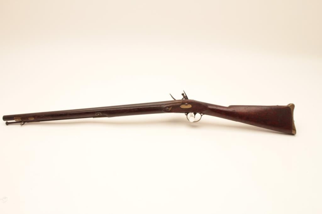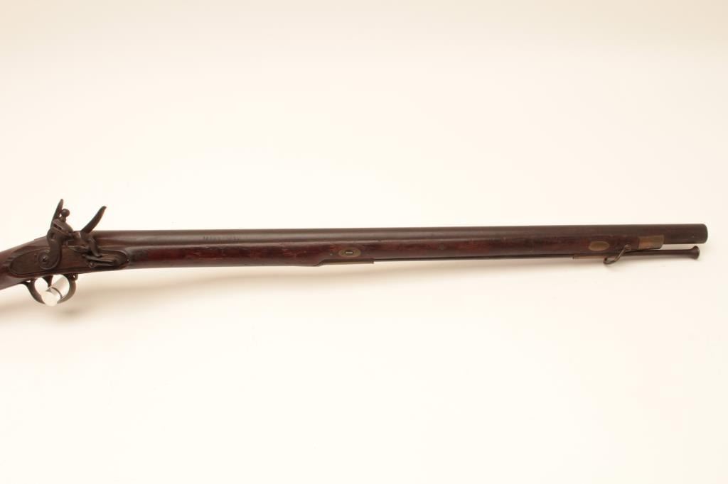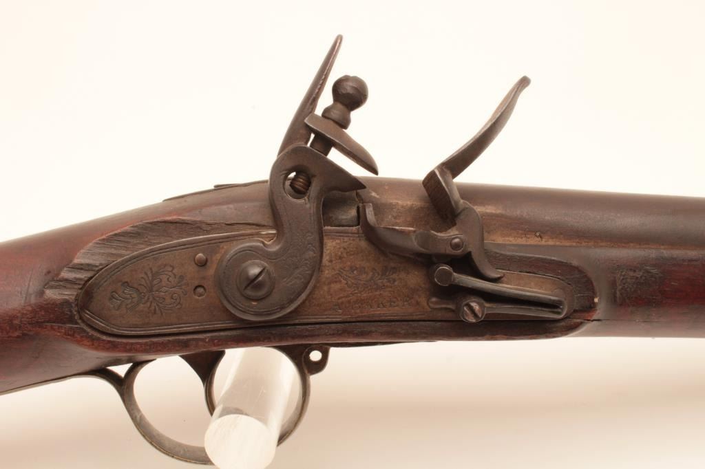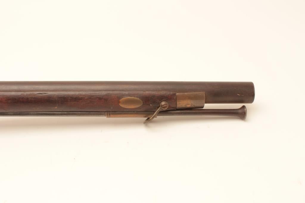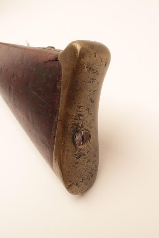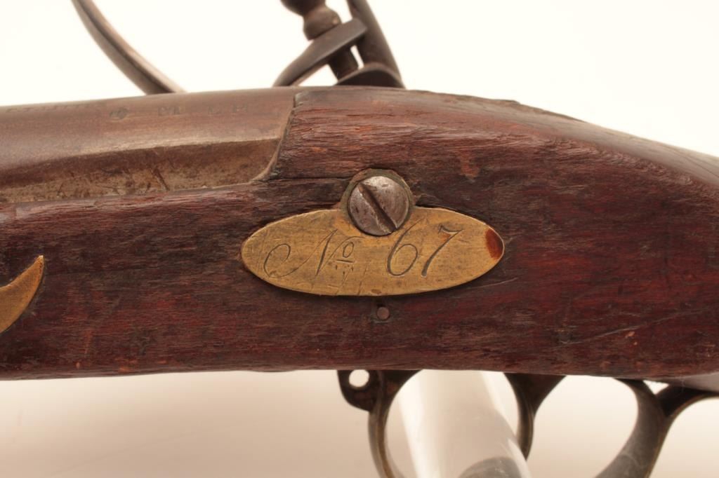Flintlock Musketoon with Fencible style heavy brass butt with lock marked “A. Baker” and barrel marked “C.T. Little” along with American style “P” proof mark. Large “M” inspection an L.H. Simple American stylingwith No 67 engraved on brass lock plate. Very good “out of the attic” condition with dark brown patina, good wood with military storage type marks and dings. Chip of wood missing along the top rear edge of the lock plate.Action works well and original flintlock parts. Correct to the period load rod. Missing rear swivel. 43” overall with a 27 1/2” barrel of 69 caliber smoothbore. We could find no reference on this sea servicestyle Musketoon but the butt is similar to American Marine issue Fencible Muskets. Probably a state or Merchant Marine purchase. Should be researched further. Est: $750-$1,500