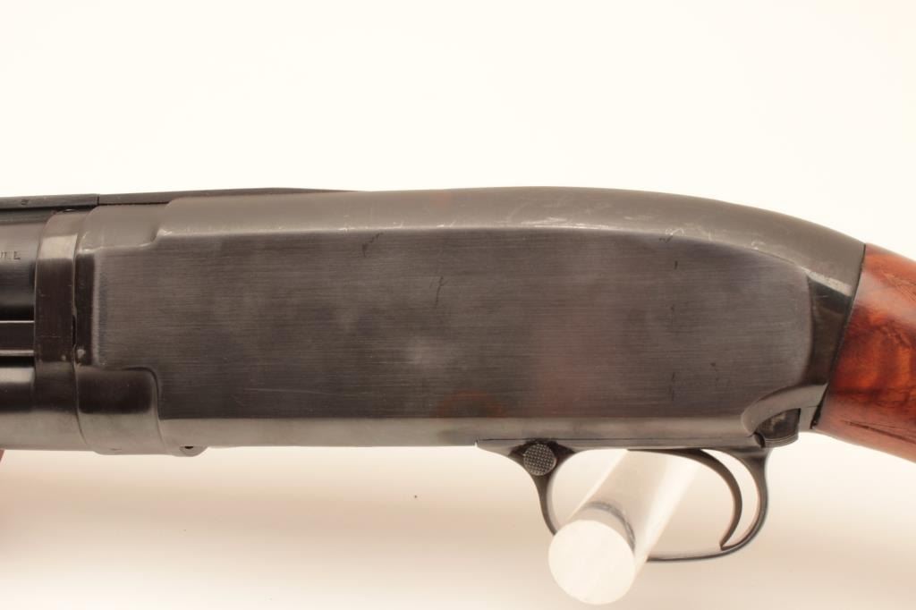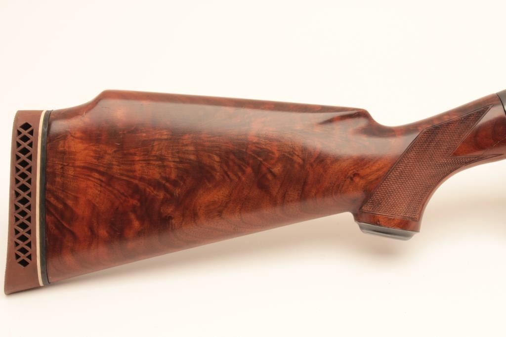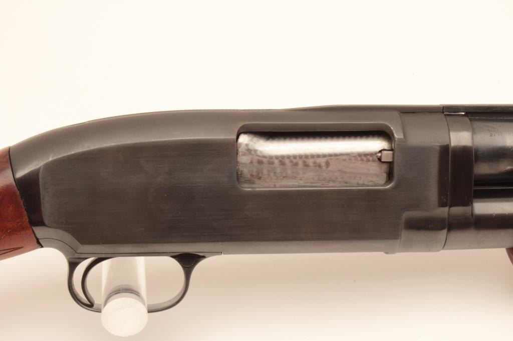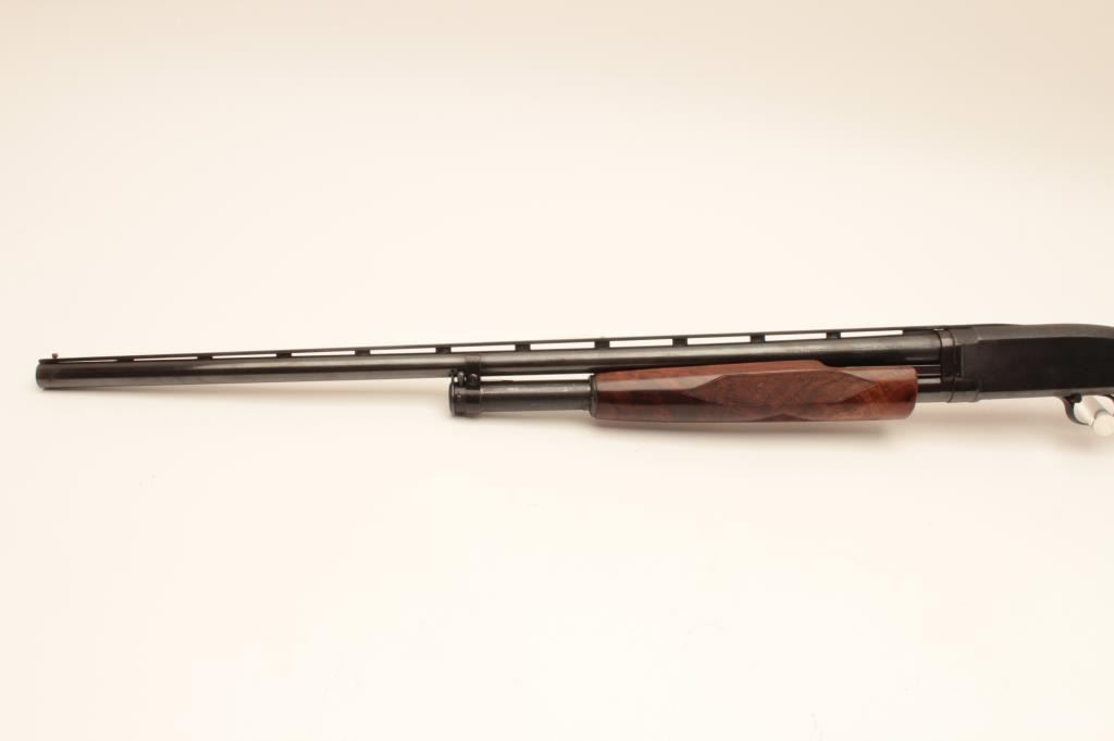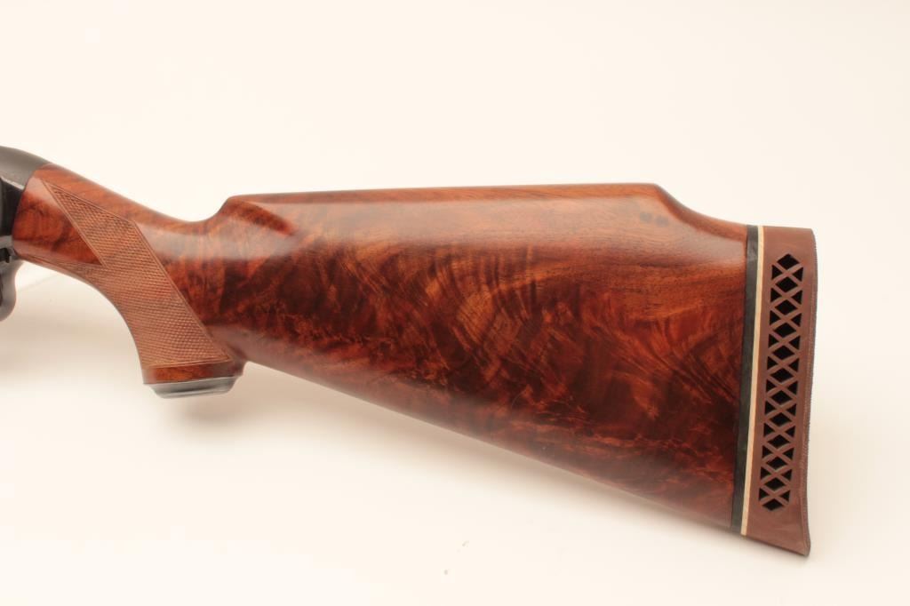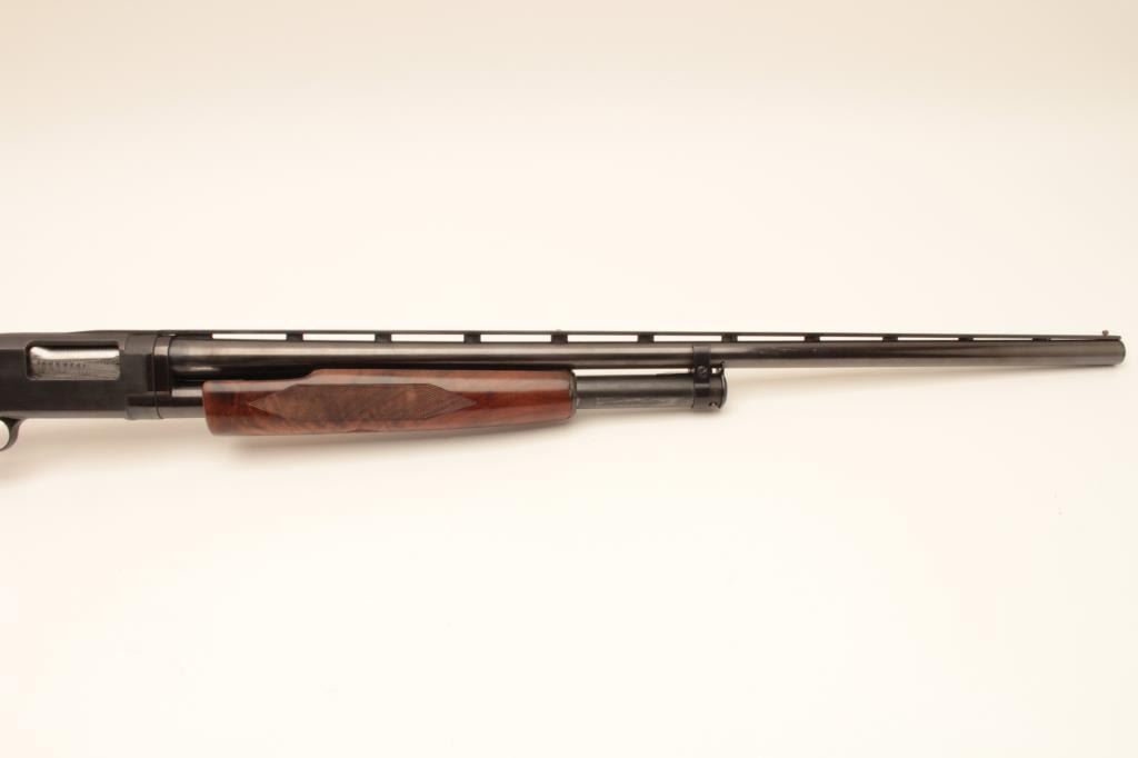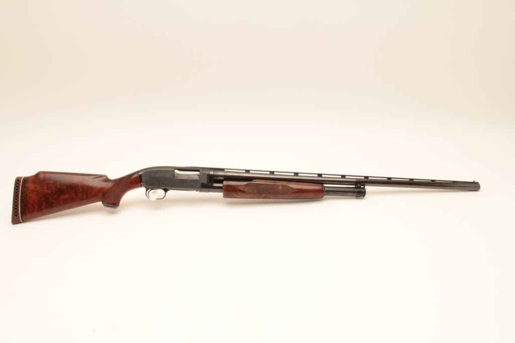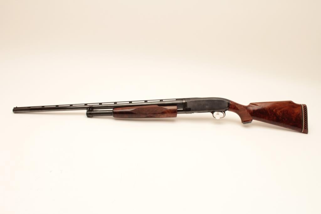 Winchester Model 2, 12 gauge pump action shotgun upgraded to trap by Simmons. Serial #163301. 30” vent right barrel full choke and Simmons marking on rib. Fine factory style deluxe checkered burl wood stock with factory style checkering and blued steel pistol grip cap. 95%-98% as stored condition. 14” to end of pad. Est: $500-$1,000