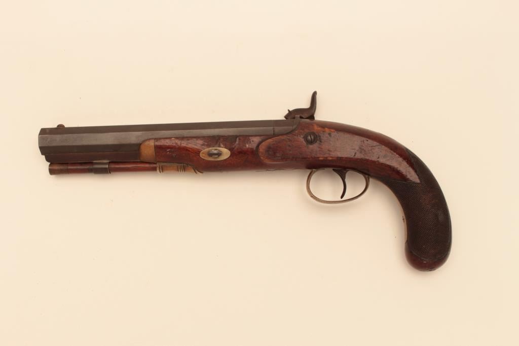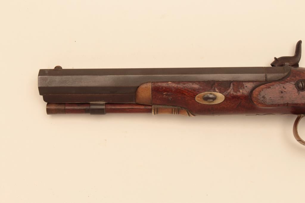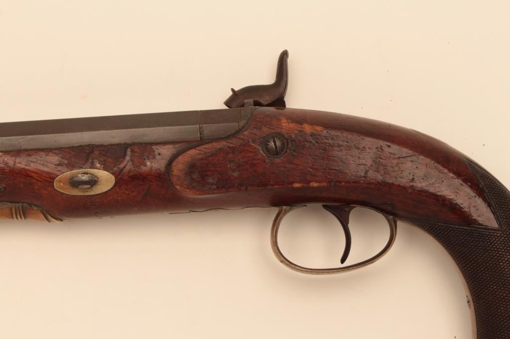 American Dueling Pistol by Constable of Philadelphia circa 1850s approx. 46 caliber smoothbore w/8; 3/8” Heavy barrel, Metal good to very good with most original brown on BBL, silver case colors on lock, stock showssome large chips and marks on left side by Escutcheon otherwise good to very good, sound action, with original Rod, A very desirable make. Est:$1500-3000
