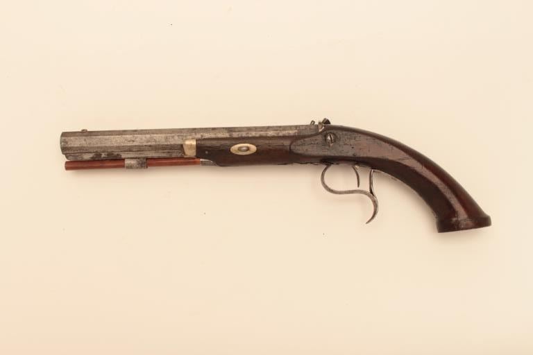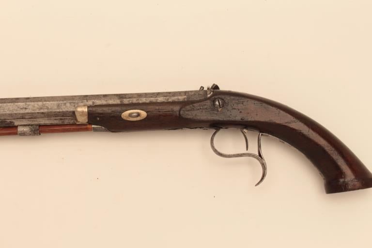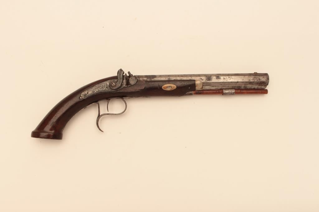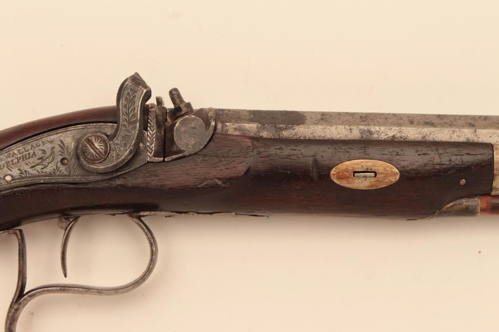 American Dueling Pistols with Lock signed Sprang and Wallace Philadelphia and BBL signed H.Gibbs Lancaster PA. Plaque in butt described in period block letters C.W. Morris. 17” overall w/9 ¾ heavy octagon BBLof approx. 50 cal rifled metal shows light to moderate pitting and cleaning. Top of hammer broken off, wood good with even wear and imperfections. Rod replaced, Gibbs was a very well recognized gun making family.Est:$700-1400