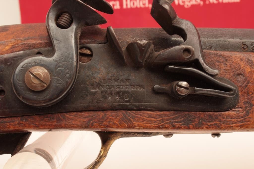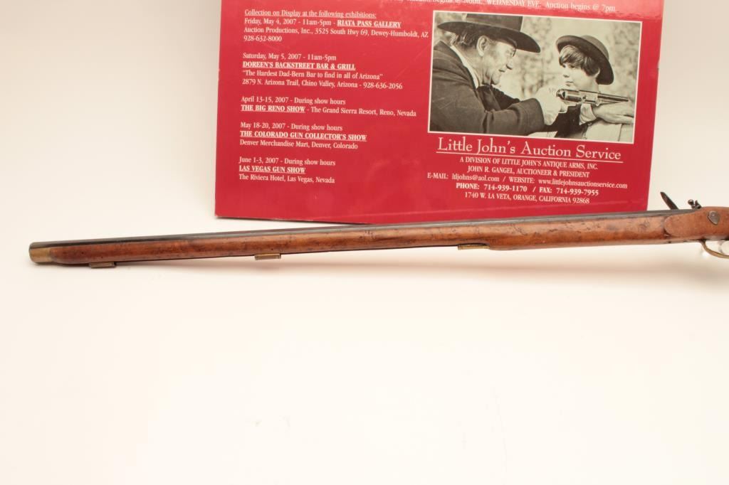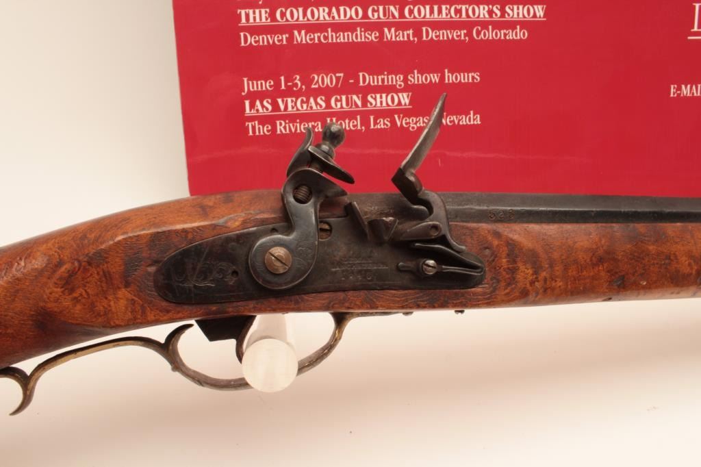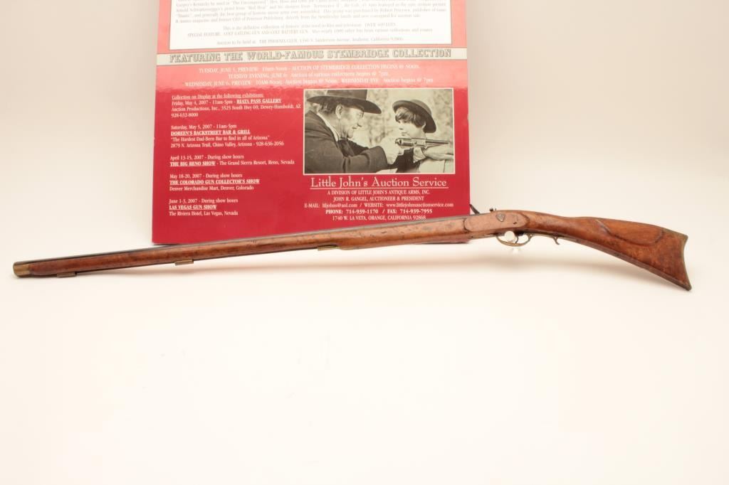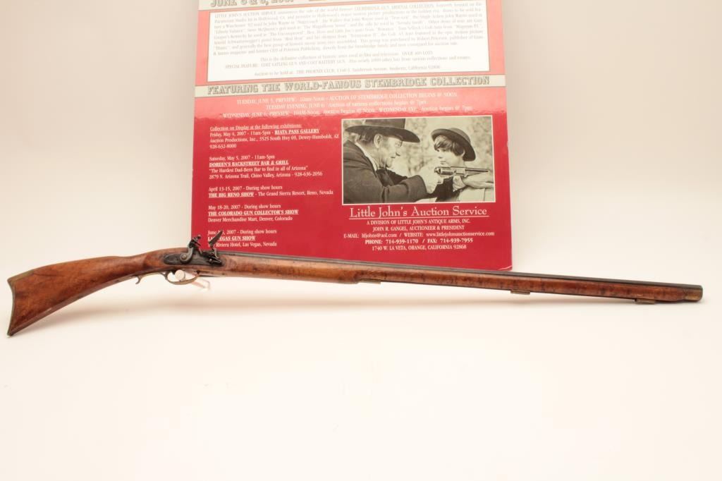 Flintlock Kentucky style rifle with lock marked Leman - Lancaster - 1840. Stembridge Gun Arsenal # 523. Listed and described at lot # 233 of the Stembridge Auction Catalog by Little John's on June 5-6, 2007. 39 1/2"blued octagon barrel of 40 cal., modern restocked, circa pre-war by Stembridge gunsmiths. No ramrod, stock cracked, guns like this were used in many epic Hollywood Golden Age films. We have had severalsimilar identified to "The Kentuckian" starring John Wayne, "The Unconquered", "Drums along the Mohawk", "The Kentucky Rifle", etc, etc, etc. May be the identifiable by further research in stillphotos. (Antique) Est. $750-1500