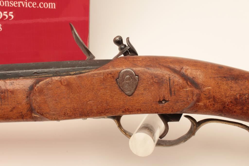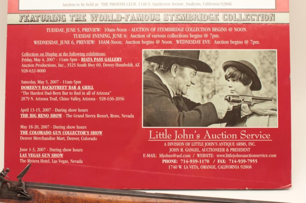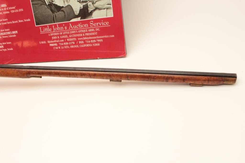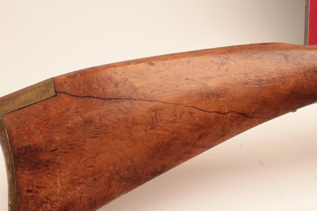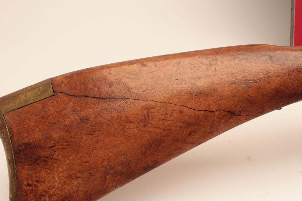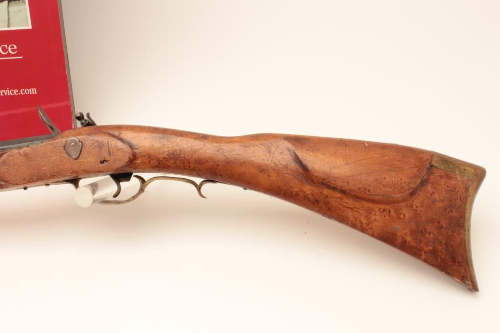 Flintlock Kentucky style rifle with lock marked Leman - Lancaster - 1840. Stembridge Gun Arsenal # 523. Listed and described at lot # 233 of the Stembridge Auction Catalog by Little John's on June 5-6, 2007. 39 1/2"blued octagon barrel of 40 cal., modern restocked, circa pre-war by Stembridge gunsmiths. No ramrod, stock cracked, guns like this were used in many epic Hollywood Golden Age films. We have had severalsimilar identified to "The Kentuckian" starring John Wayne, "The Unconquered", "Drums along the Mohawk", "The Kentucky Rifle", etc, etc, etc. May be the identifiable by further research in stillphotos. (Antique) Est. $750-1500