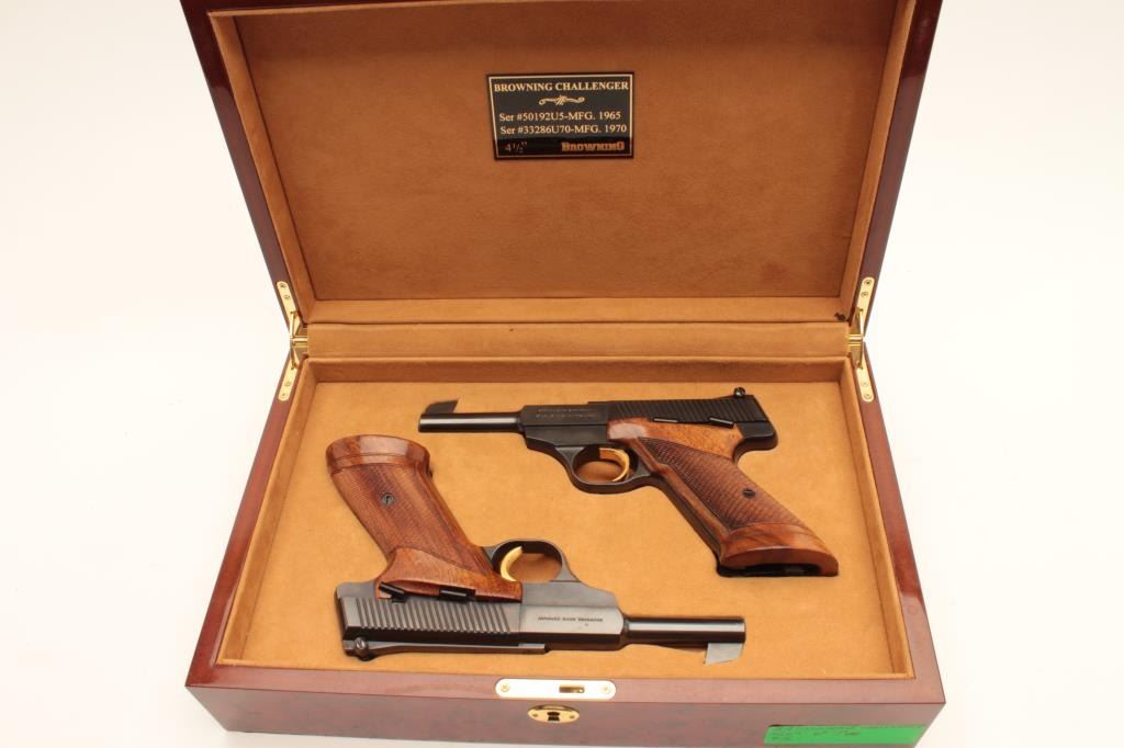 Custom Cased Set of Belguim Browning Challengers with checkered wood stocks, 4 1/2" bbls, gold plated triggers #50192us mfg. 1959 and 33286u70 mfg. 1970. Fine to excellent condition with 97099% rich bluefinish and near fine stocks showing a few bumps and scratches. Mechanically sound and fine bores. Excellent custom case with chamois lining and veneered wood "humidor" quality case with fine hardware. Case aloneover $600. Est:$900-1800