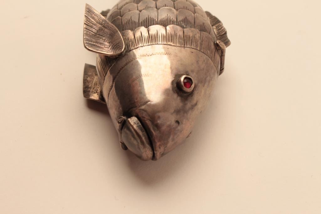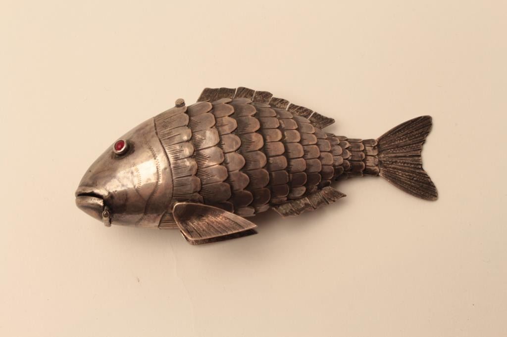 19th Century Sterling Silver Salt Cellar with Cabachon shaped Gem Stone eyes and articulated body. 5 14" in length, 2" ht. A quality European made Antique from Austo Hungarian area WWII refugee family. Nohallmarks. Est:$200-400