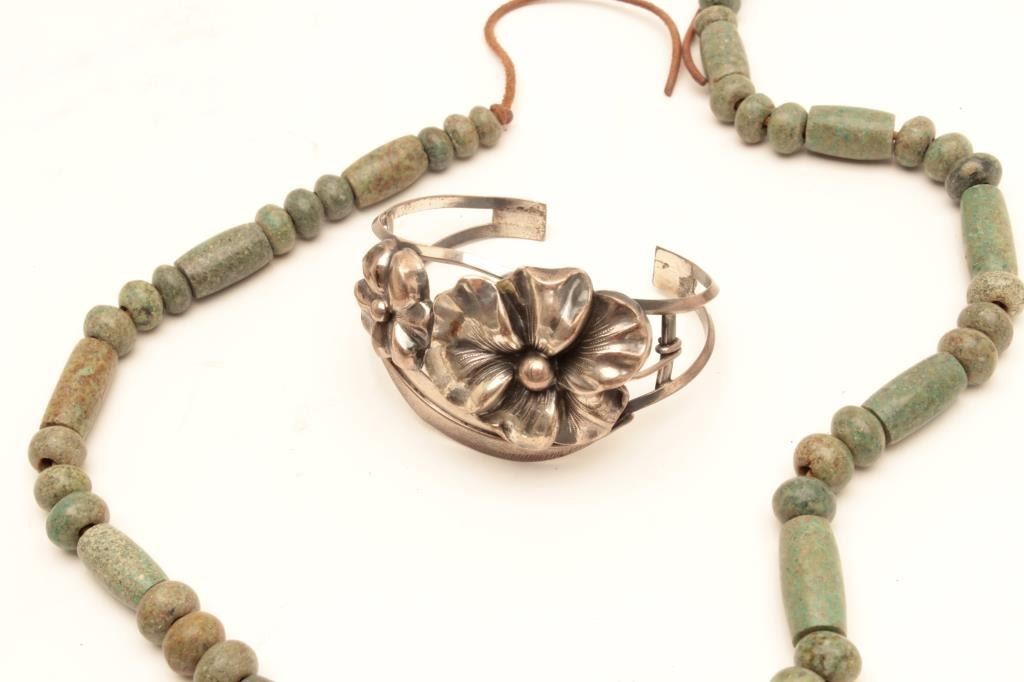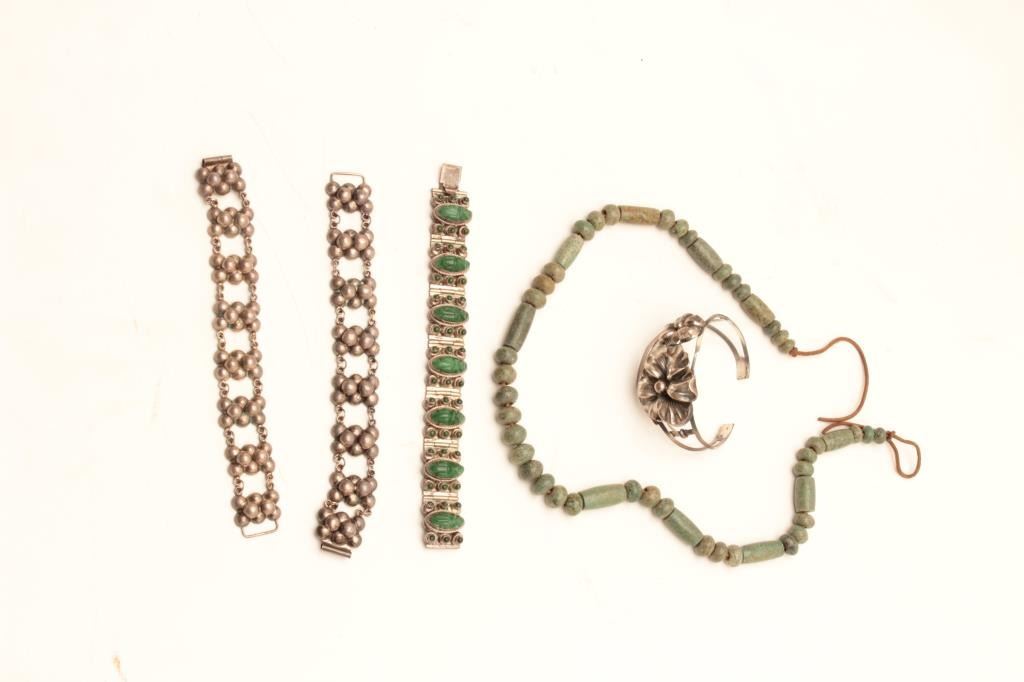 Lot of Vintage Collectible Mexican Jewelry, 4 silver pieces, 1 stone beads 100 years old or older. Est:$150-300