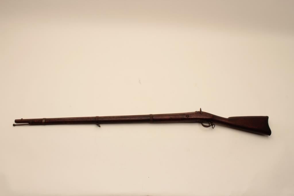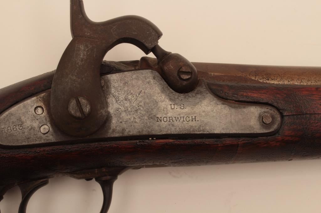 1861 Model Contract .58 cal. rifled musket by Norwich dated 1863. Fair to good condition showing minor rust and pitting and weathering to wood. working action. Old replaced ramrod. An uncleaned Civil War Relic (borerough may clean). Est:$500-1000