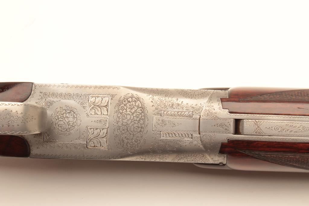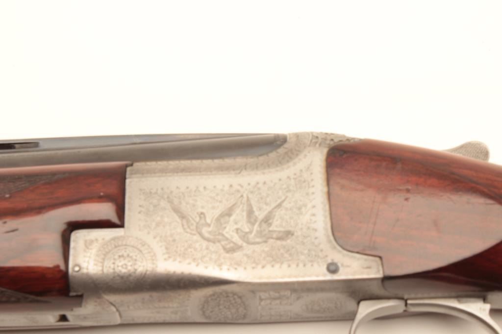 Browning Pidgeon Grade O+U 12GA shotgun signed Funken and early production #21356, 28” BBLs, single trigger, auto ejector, choked skeet skeet. 14 ¼ inch to end of pad, 13; 1/8inch to end of wood (Very goodcondition 85-95% overall and showing some use) tight lock and bright bores Est :$3000-$6000