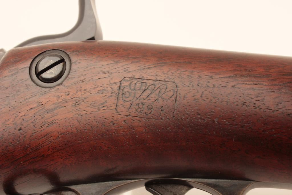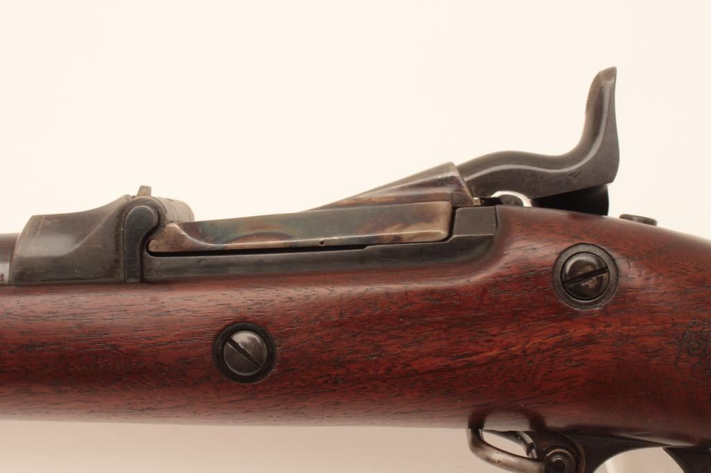 Springfield Model 1884 trapdoor rifle with ramrod bayonet in excellent original condition #528154 stock cartouched 1891. 90-95% original blue with minor drifting and tuning. 90-95% bright and colorful case.Hardening on breech and tang, excellent bore, stock also excellent with very small imperfection. A 9.5 of a 1-10 scale. Est:$1400-2800