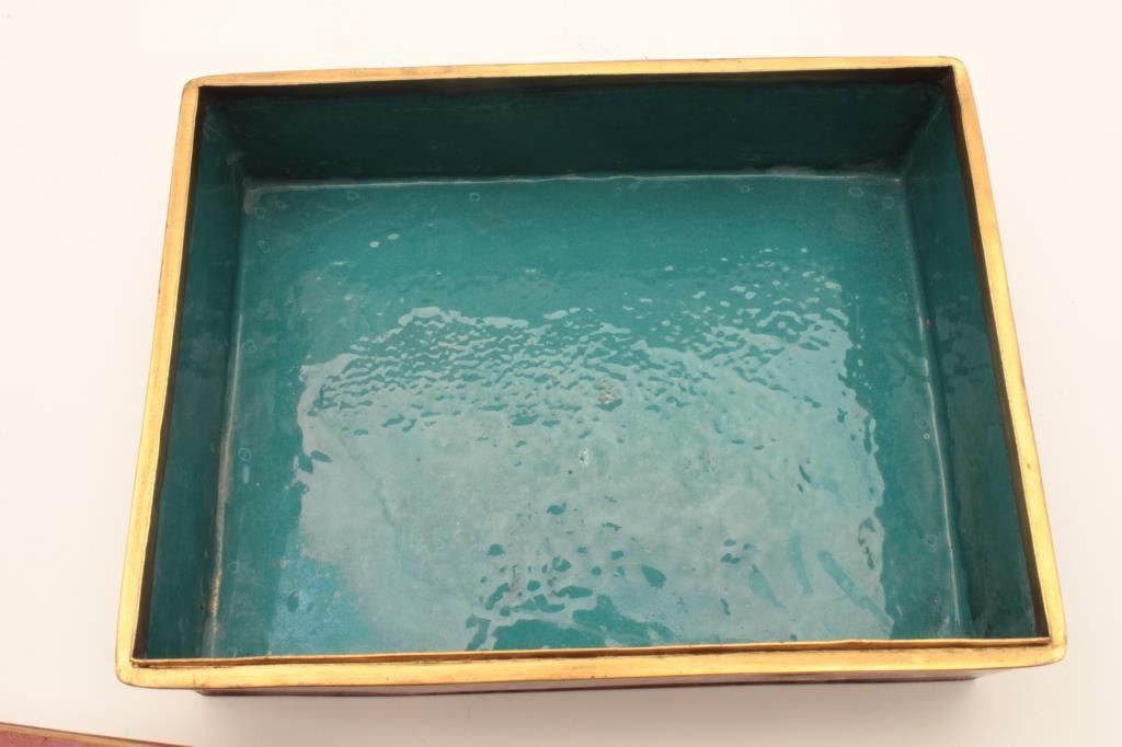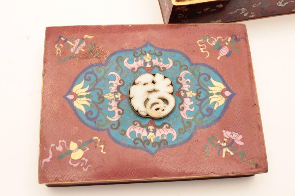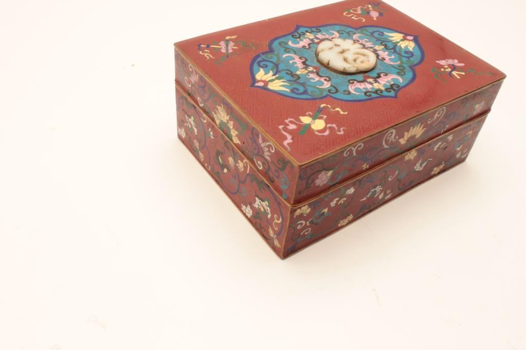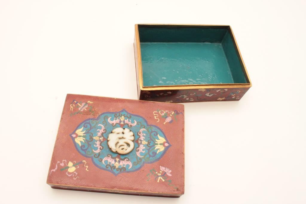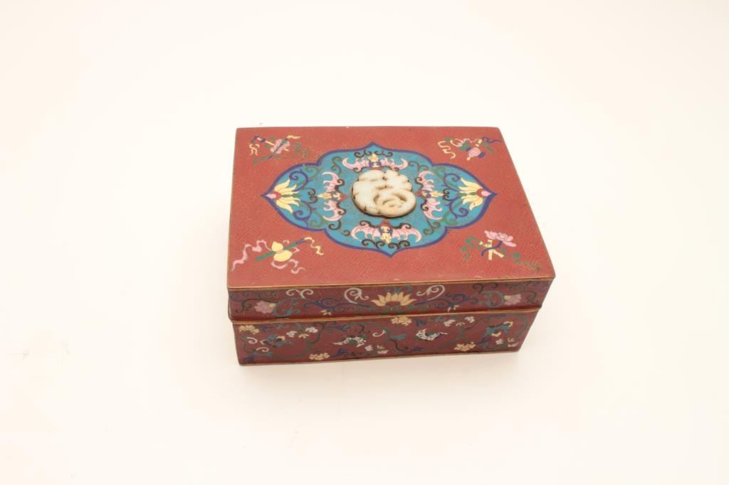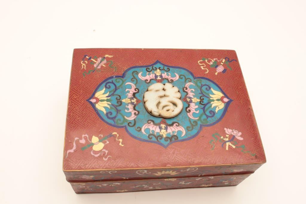 Chinese vintage cloisonné box with canned Jade inlay in LID. Shows stylized and subtle 19th century motiff circa about 1800-1890 and not “Flashy” style for export in our opinion. 4 ½ height and 9 ¾ width. The estate of WM Ashby purchased in 1980s from Lyle Corcoran collection (Franklin Mansion- Hollywood owner who’s collection we sold at new Otani Hotel, LA. Est:$350-700
