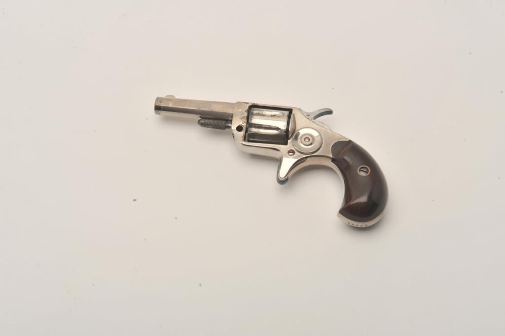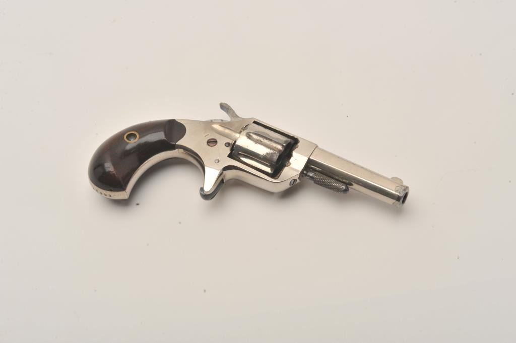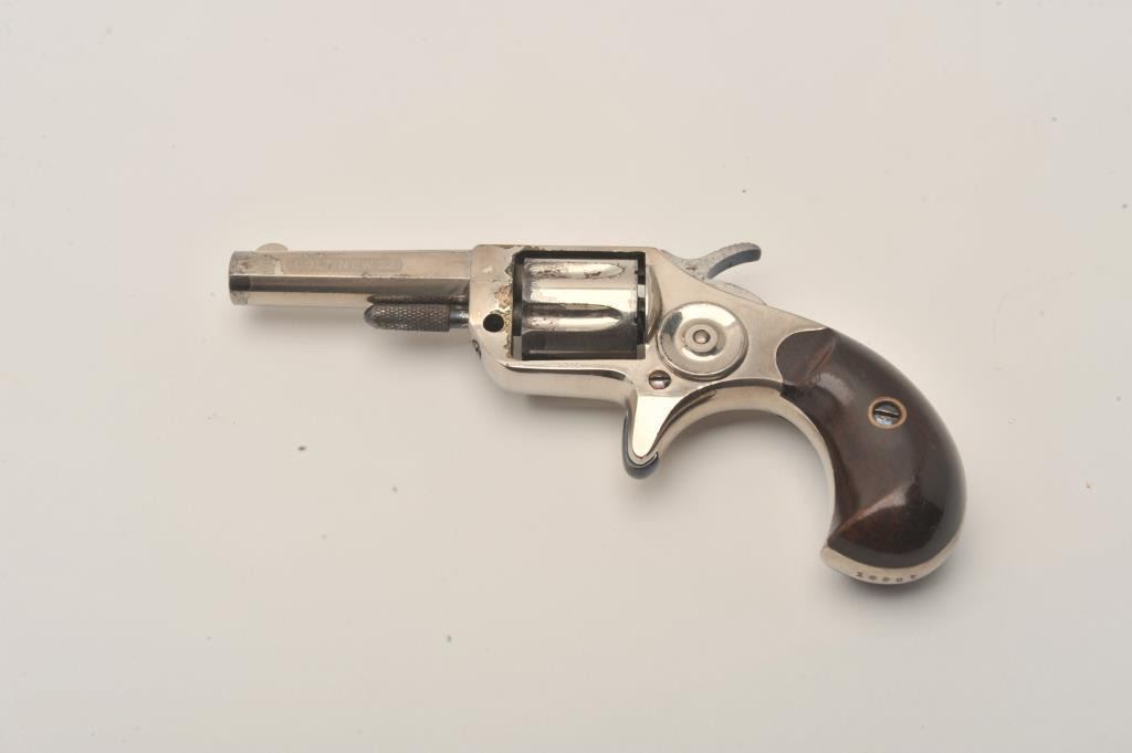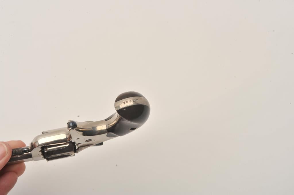 Colt New Line .22 revolver with minty etched panel "Colt New 22" and nearly all its original bright nickel finish. Excellent grips. Has most original niter blue on back of hammer. Missing take down pin. Replace itand it is a nearly new Colt New Line.22. (Antique) Est:$250-350