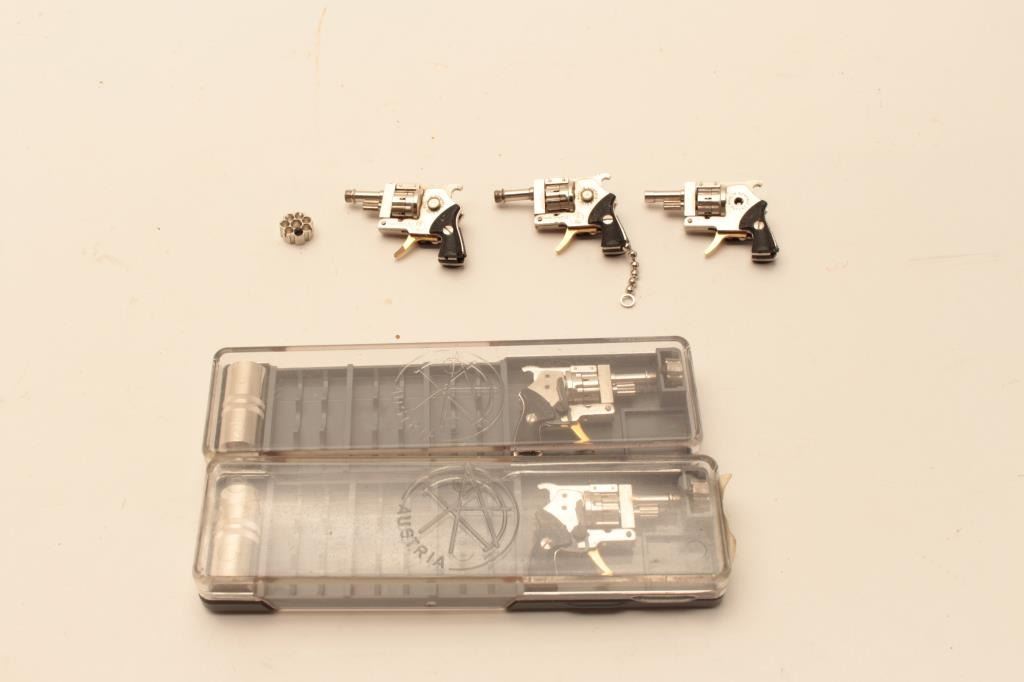 5 Austrian mini revolvers by Andrew Dworky. 2 in plastic case with blank 2mm CTG. Est:$175-350