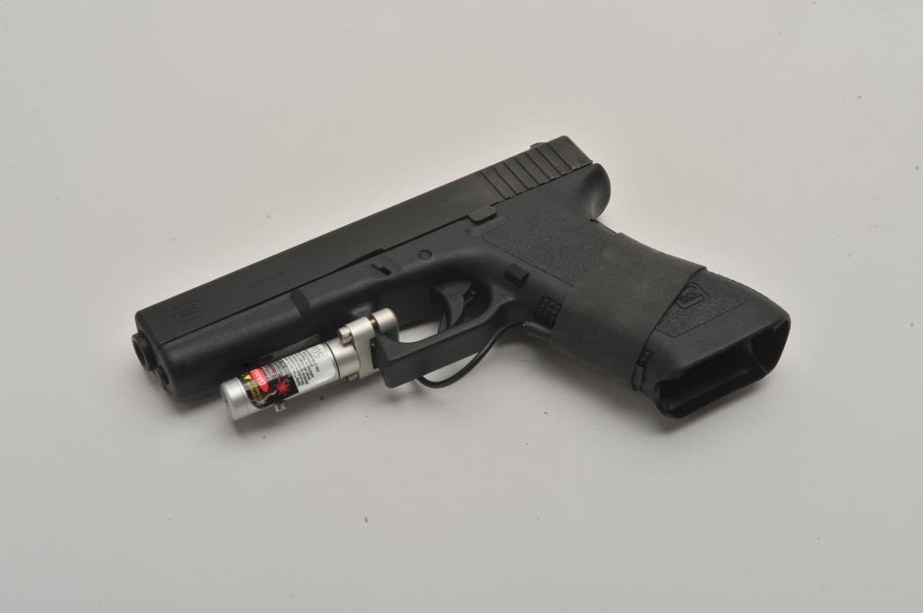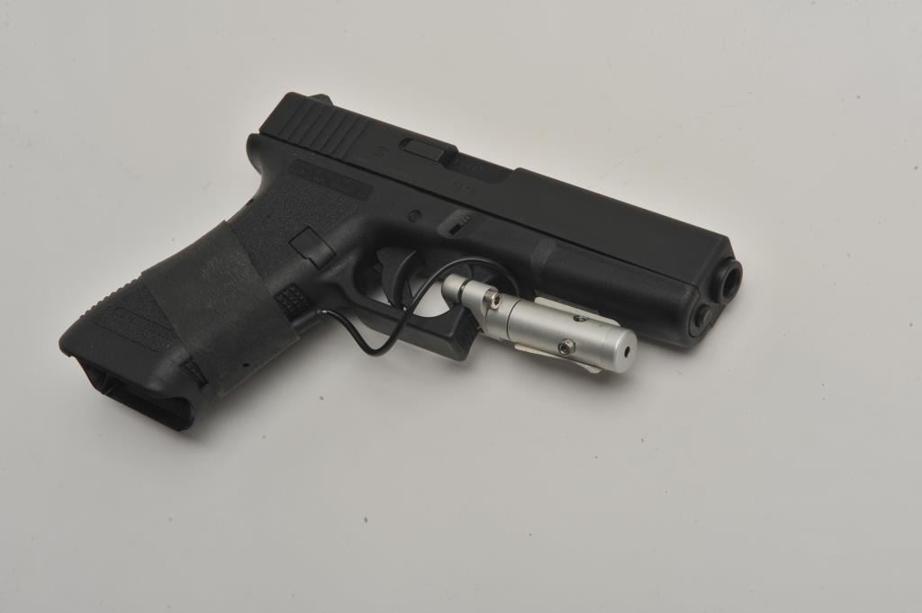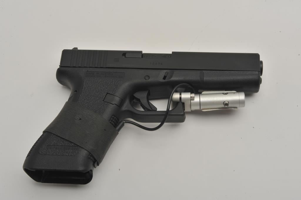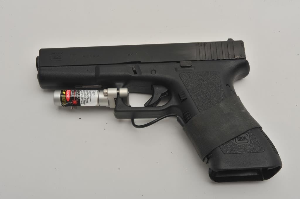 Glock Model 17, 9mm semi auto pistol with lazer sight and 2 hi cap mags (not California desirable) #78874. Fine to excellent used condition, no box , PPT. Est:$325-650