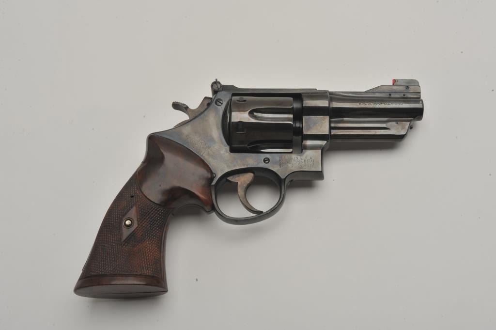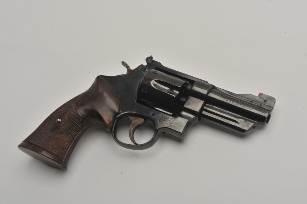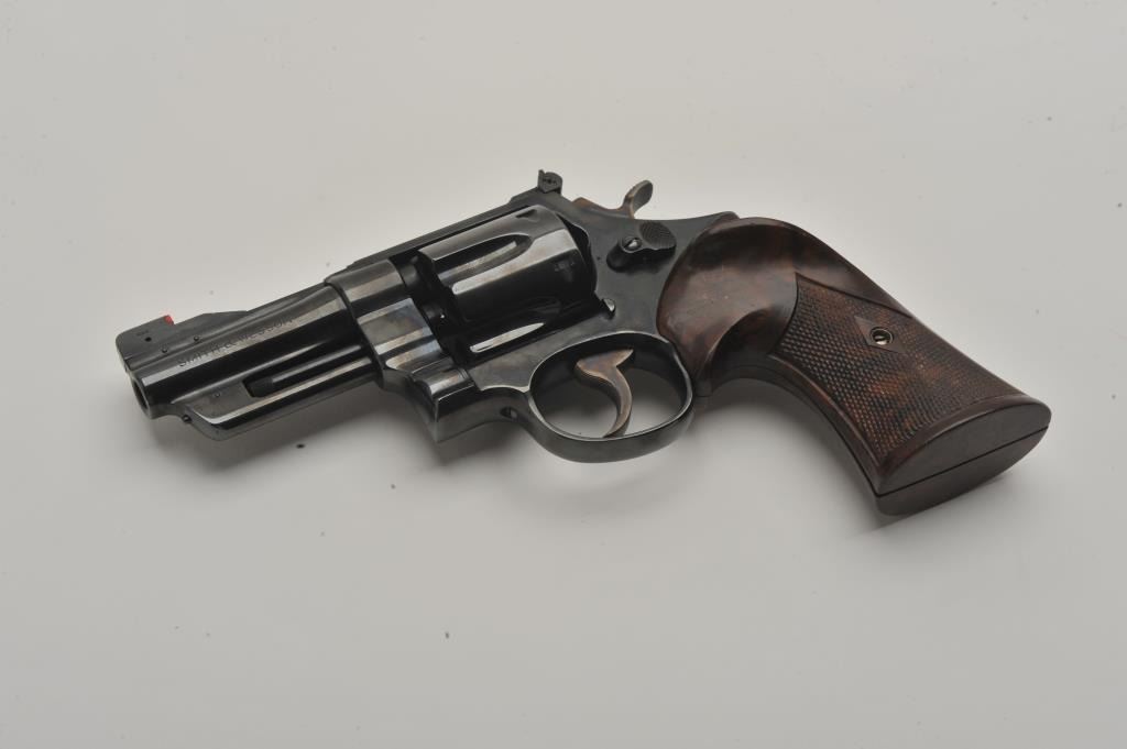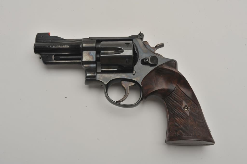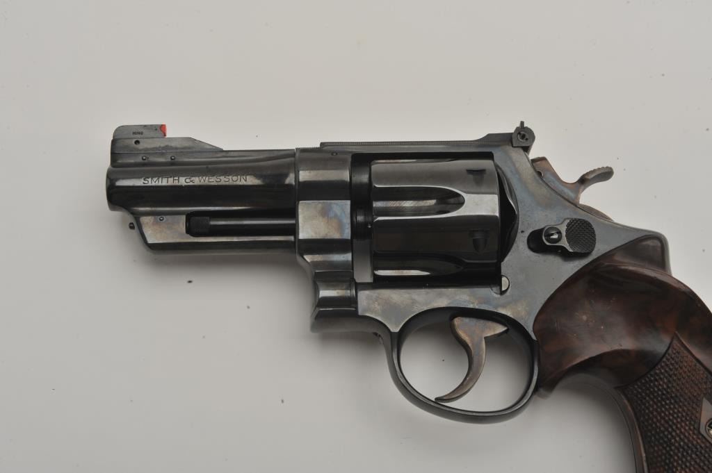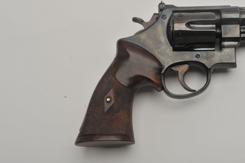 From the collection of Jerry Lewis – consignment by his estate – “Pre Model 27”-357mag D.A. (revolver)” with 3 ½ BBL king sight added, custom wood grips, re blued to excellent, mechanically excellent with finebore. (NO PPT). Est:1000-2000
