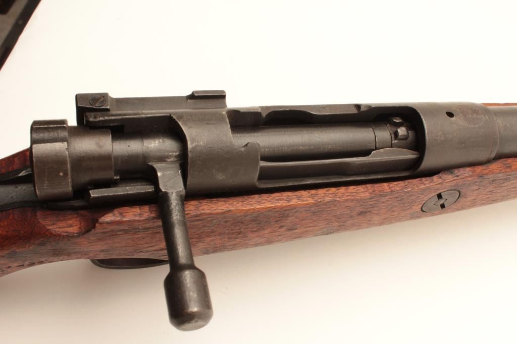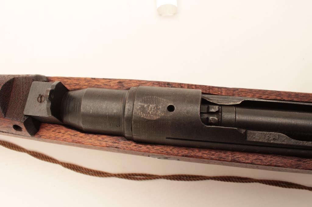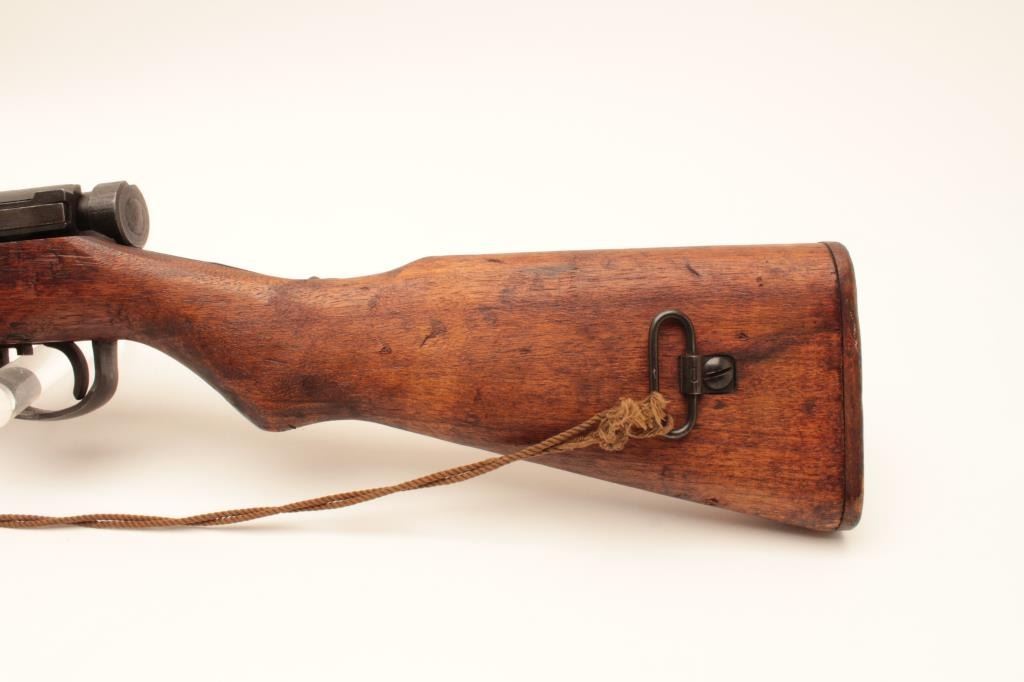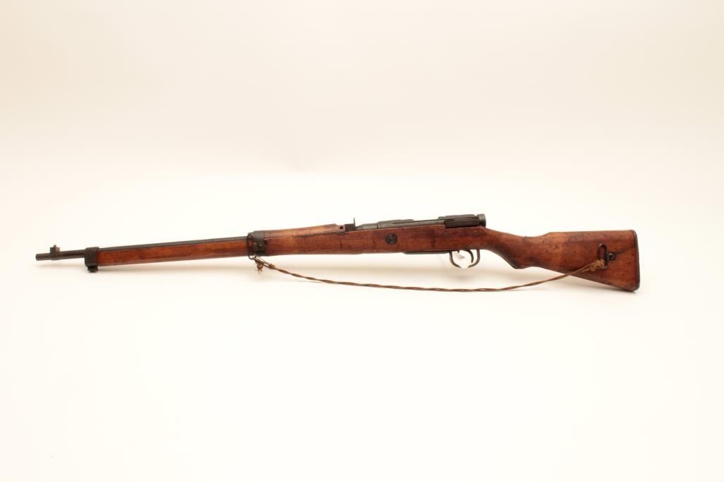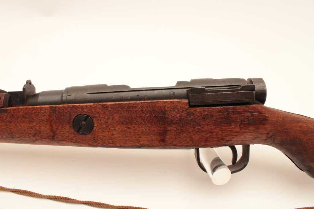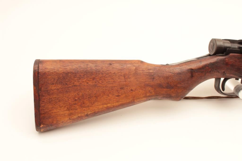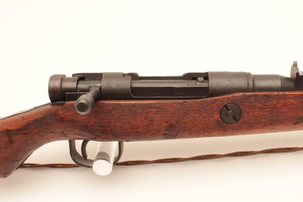 Japanese Arisaka rifle “last ditch” production with wood butt plate, late sight and crude MFG process, mum grounded, #57379, matching bolt, very good quality overall, woven cord as sling. Est:$200-400