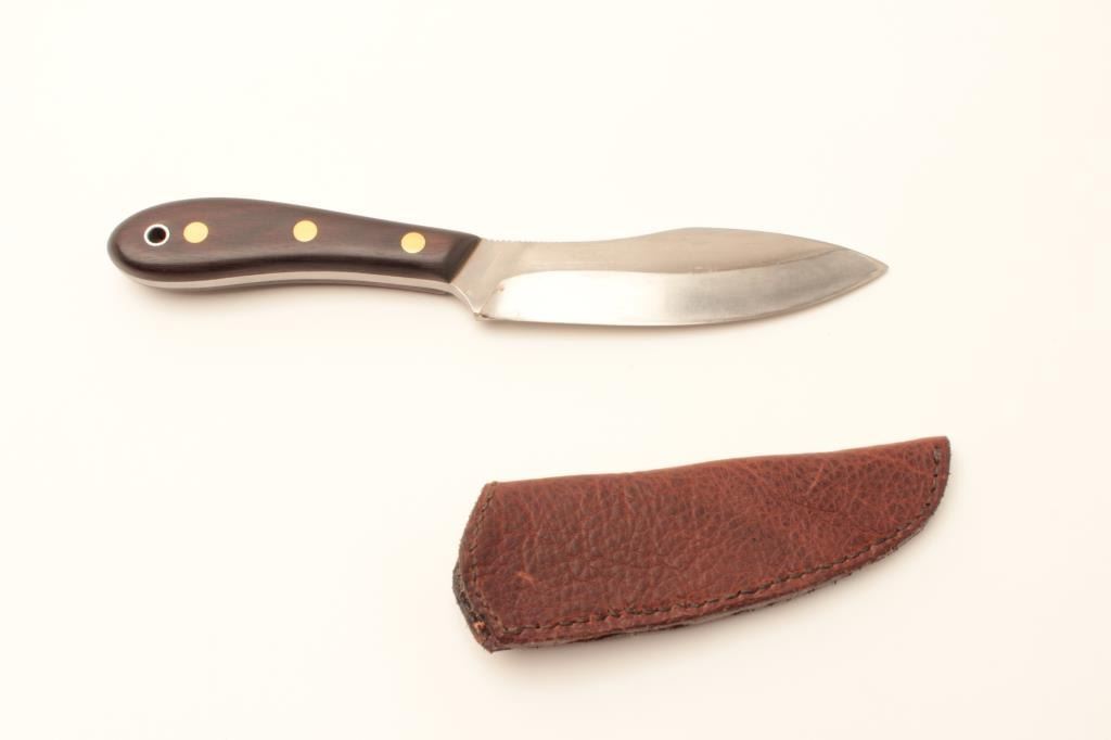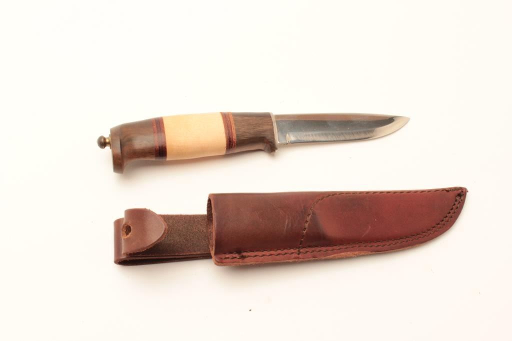 Lot of 2 sheath knives 1; Canadian Trapper by Coles Germany, Wide Rounded blade, very good condition. 10”overall and 6”blade, come with hand made scabbard. 2; Hele Norway sheath knife 4” blade. Select wood hand sharpened slightly. With scabbard High grade. Est:$150-300