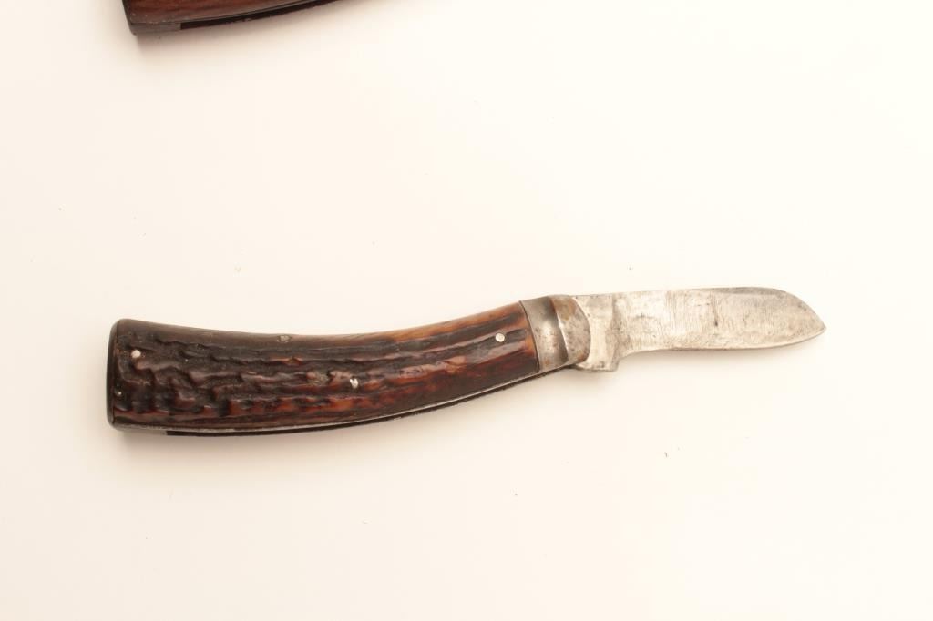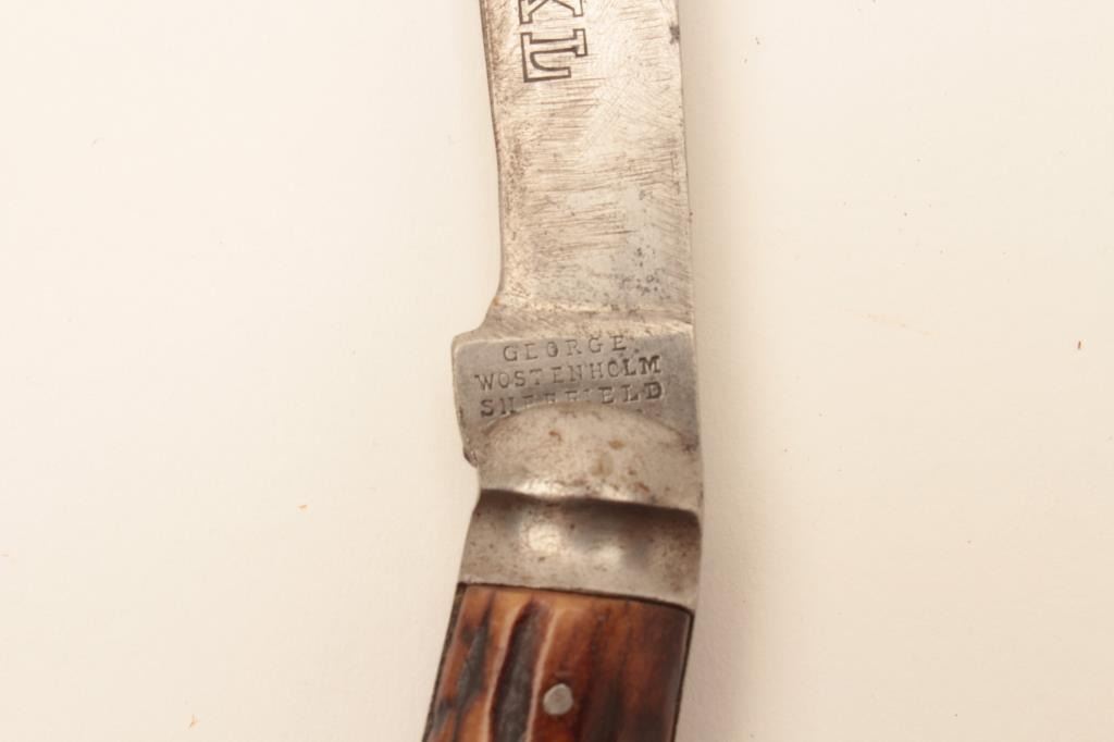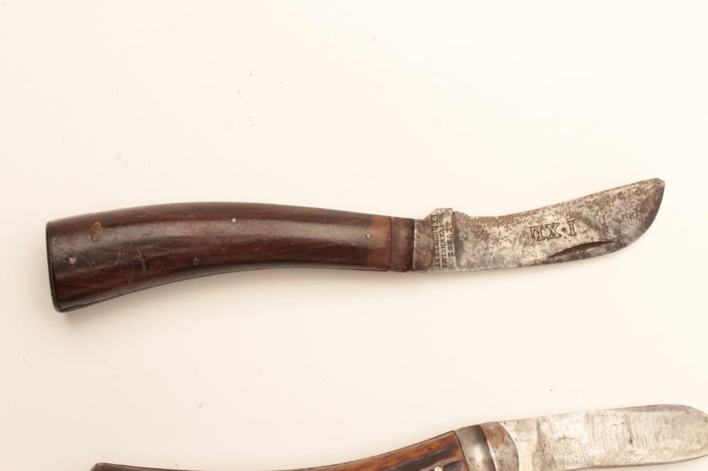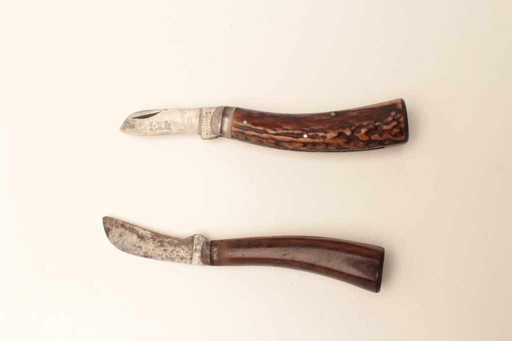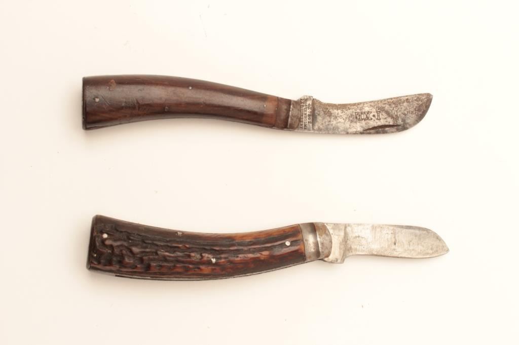 IXL George Wostenholm folding knife circa 1900 with stag grip blade shortened to halt length. IXL Hawkbill with horn grips rough, 4 ½ inch and 5 ½ inch folded. Est:$150-300