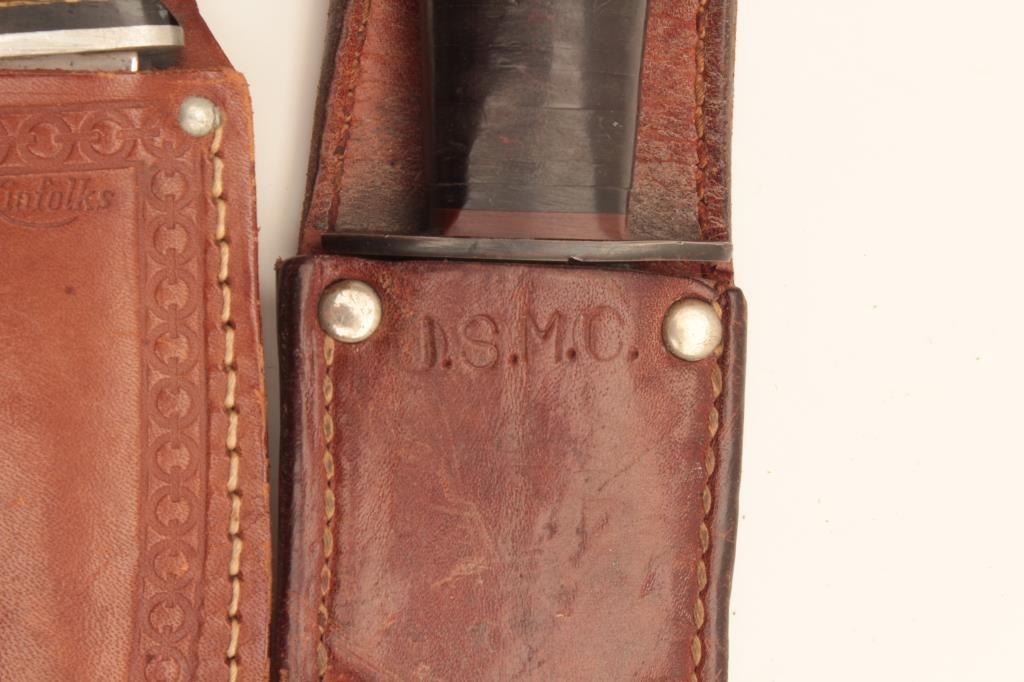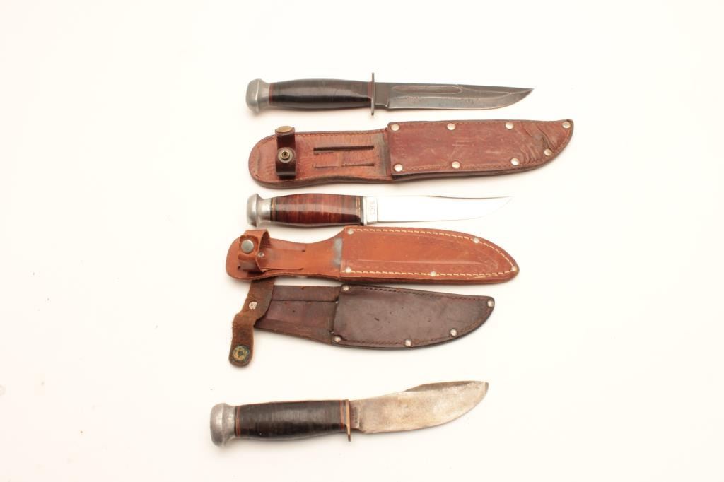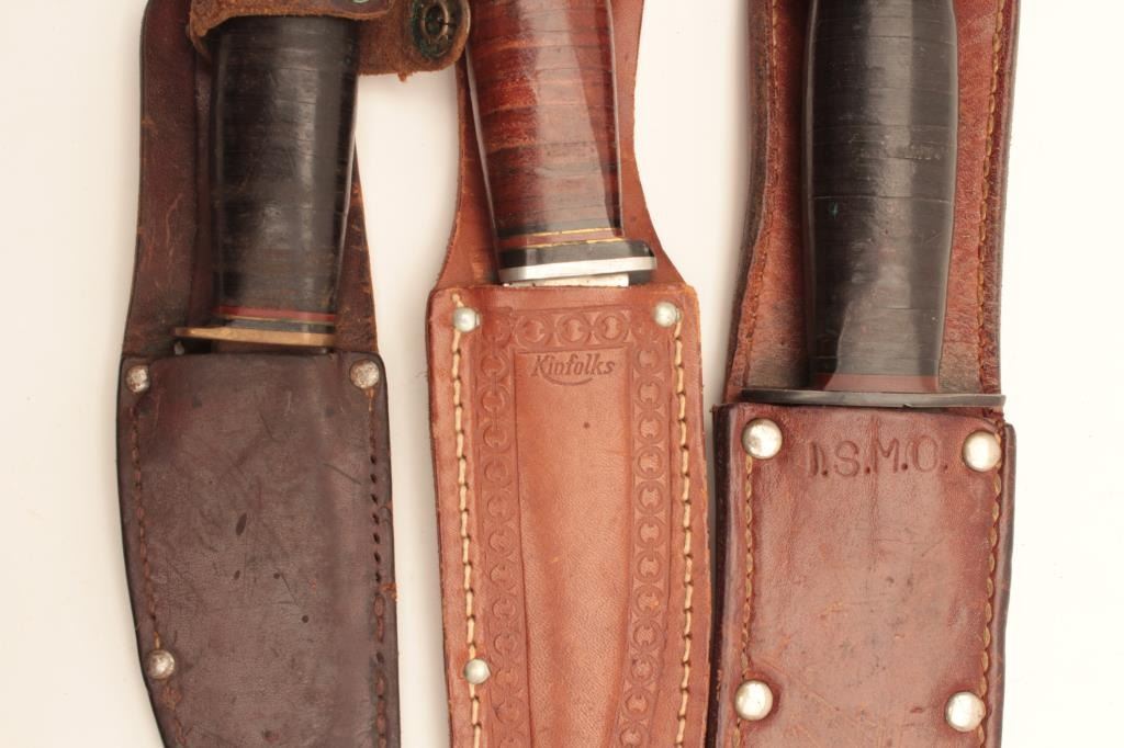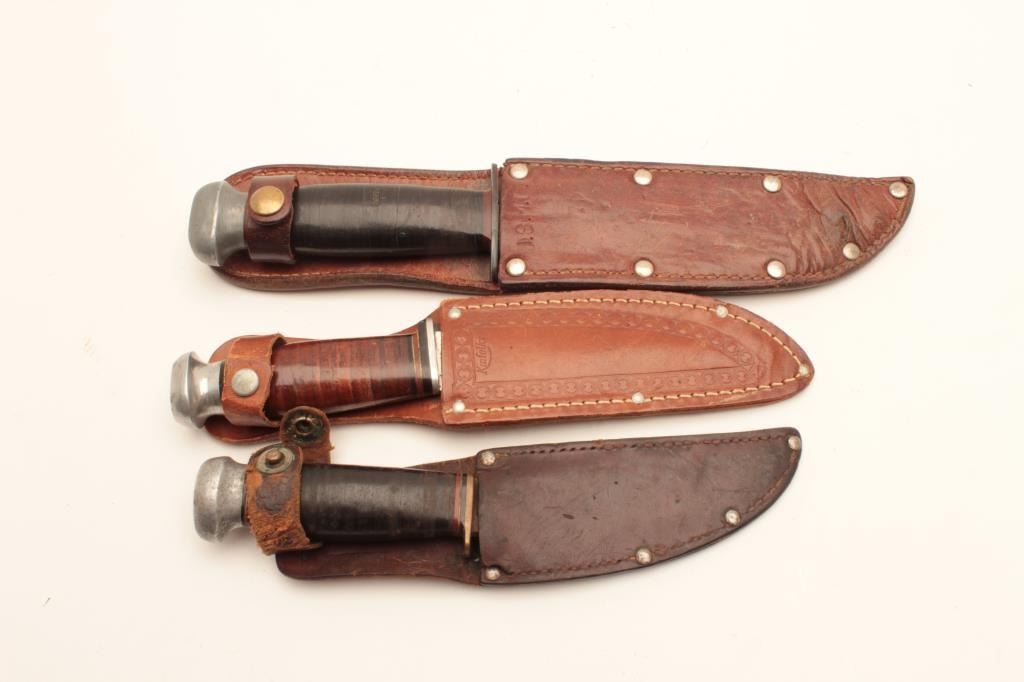 LOT OF 3 1; Pal RH 36 – USMC marked sheath, sharpened. GOOD 2; Marbles 1916 point 4” blade 8” overall with sheath sharpened in fair condition. 3; Kinfolks 9365 with sheath ejector blade, sharpened, almost fine condition. Est;$100-300