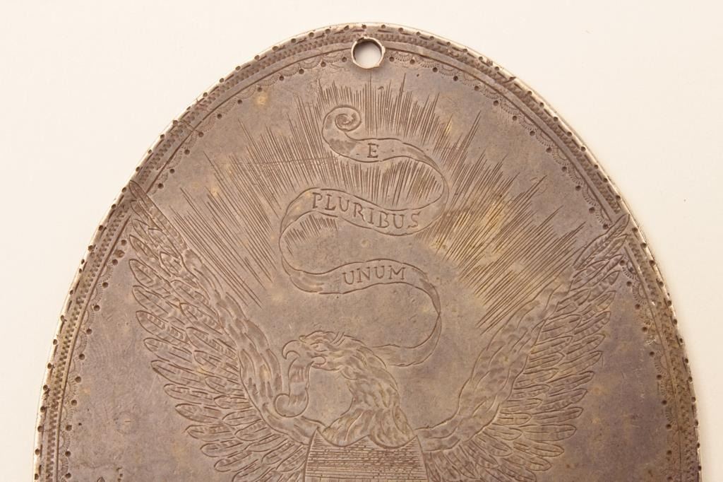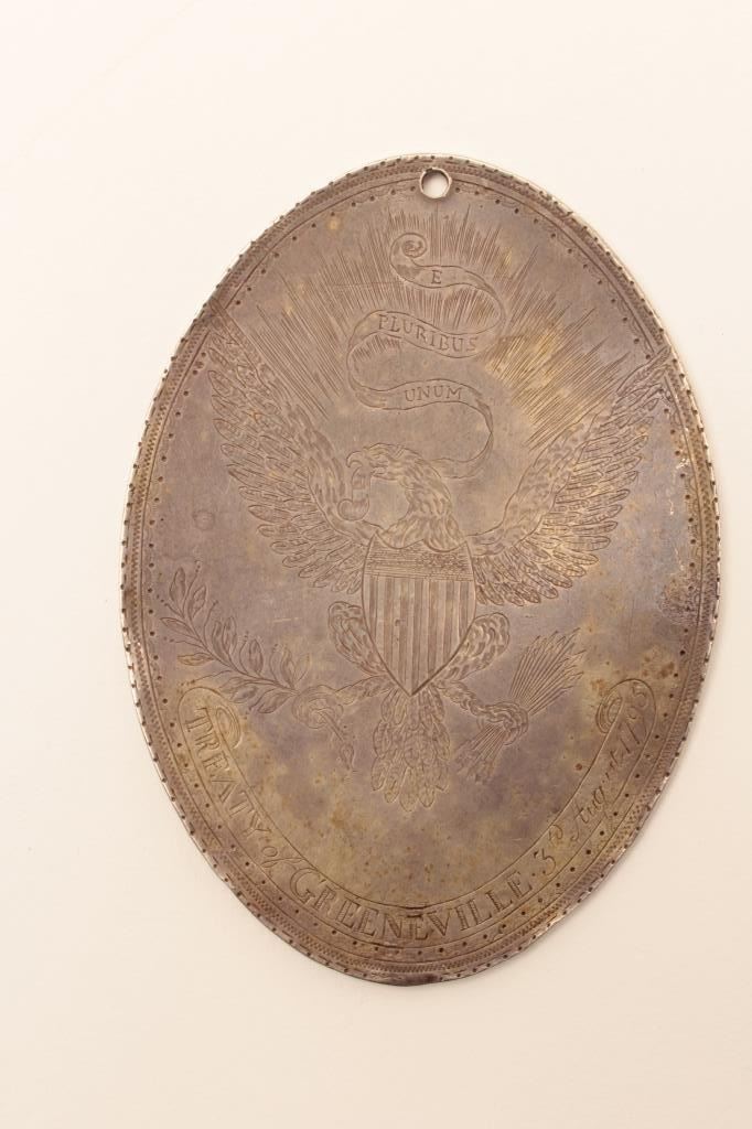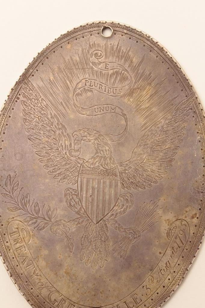 Large Hand engraved silver peace medal marked treaty of Greenville 1795, oval shaped 4” by 3” very fine workmanship but it’s our opinion they were made 1900-1940 and were never original, shown in catalogs andinventories before WW2, This was acquired by John S. DuMont in 1950s at a high cost.. Est:$300-600