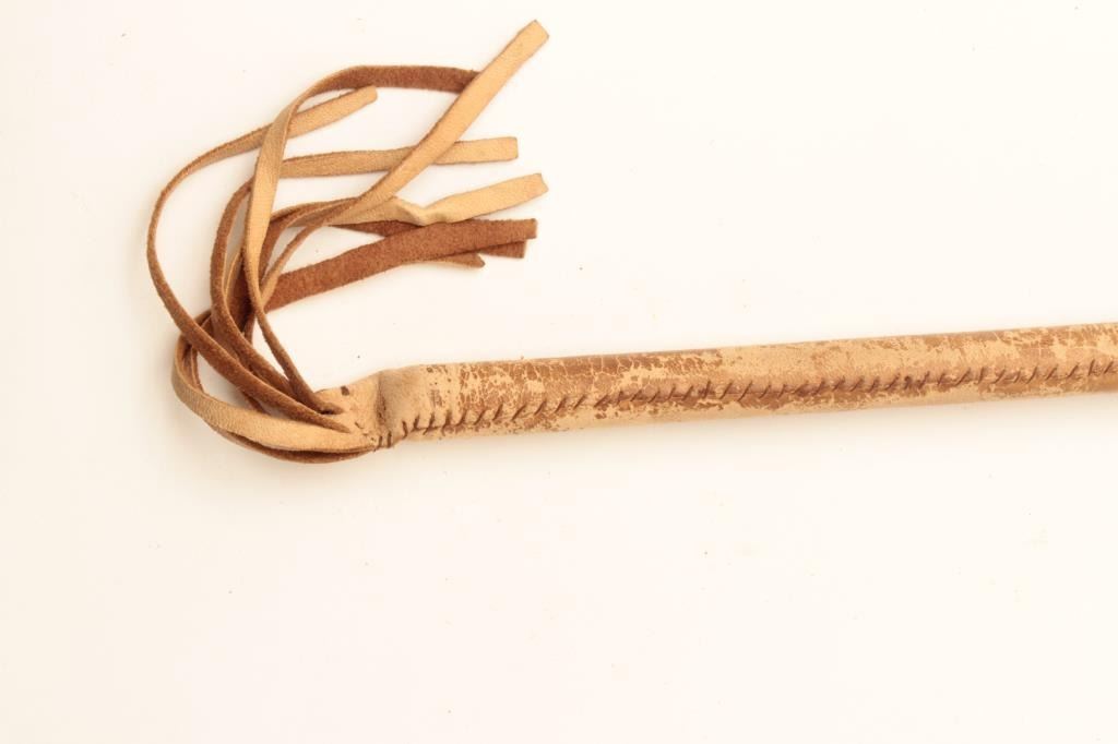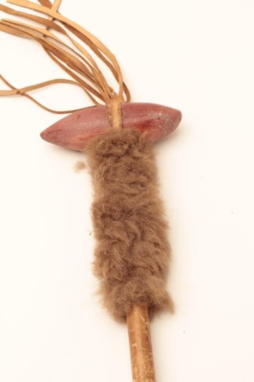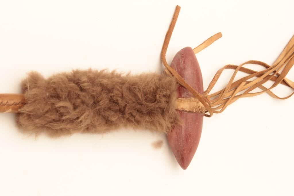 Native American Indian catlinite headed warclub with rawhide wrapped. Pointed stone head 5 ¼ inch from tip to tip club 19” inch not including fringe late 19th century to early 20th century. Probably northern tribeSioux. Est:$175-300