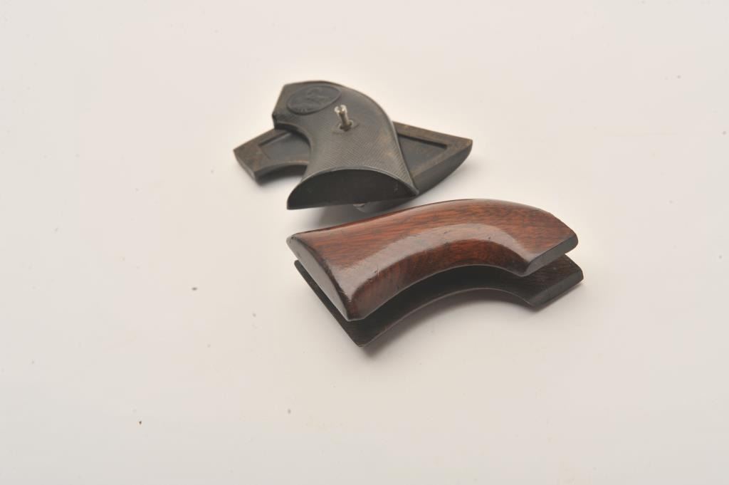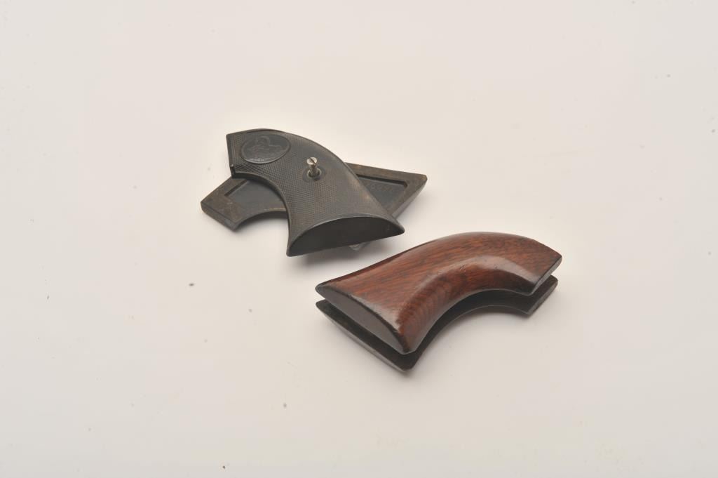 Lot of 2 authentic colt grips for first gen S.A. hand rubber #346996 sketched inside. Very good plus condition with minor imperfections. 1 piece wood Colt navy grips no sanding with light coating of latter clear vanishes, in overall very good condition. Est:$100-200