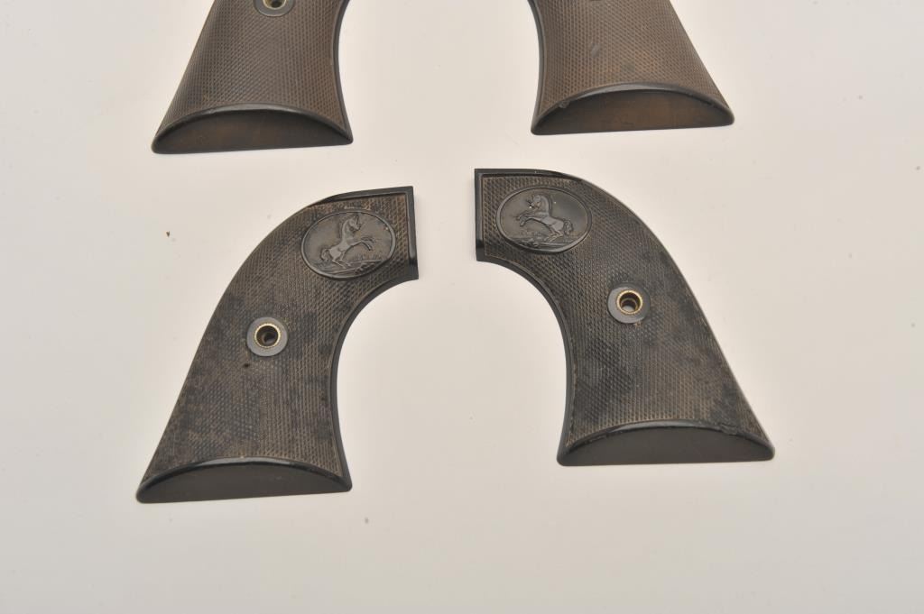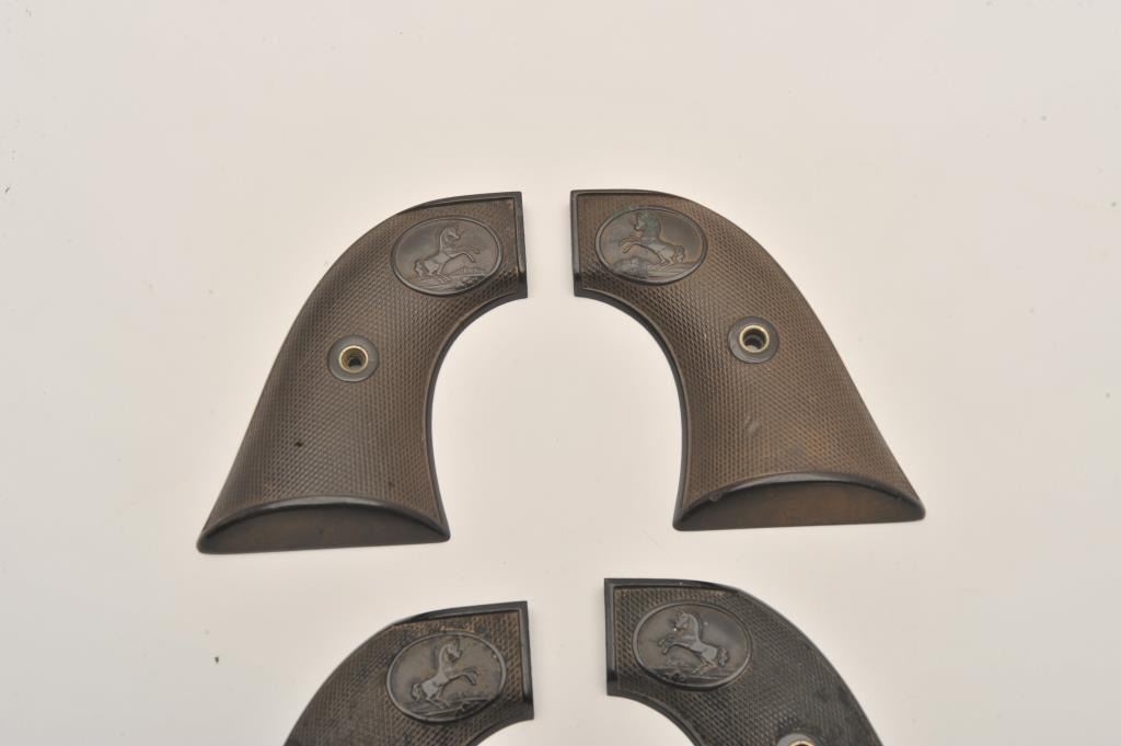Lot of 2 Colt S.A. Hand Rubber, pre-war grips stretched #194185 (1899-1900) good with escutcheon and screw. 1 pre-war shows fitting and very dirty. Correct escutcheon and screw. Est:$100-200