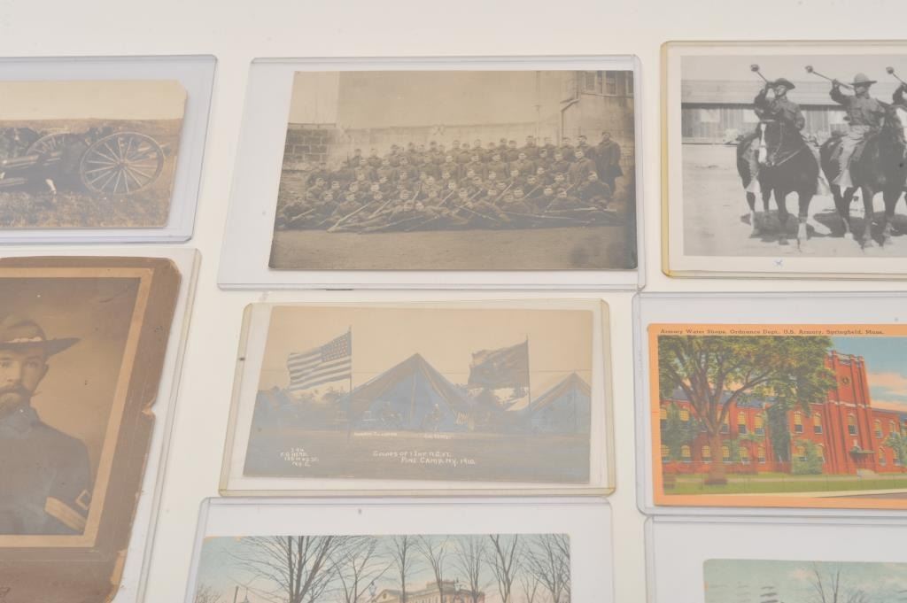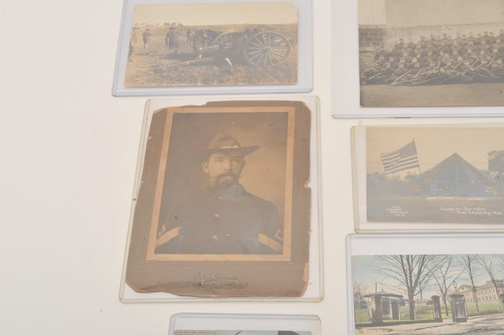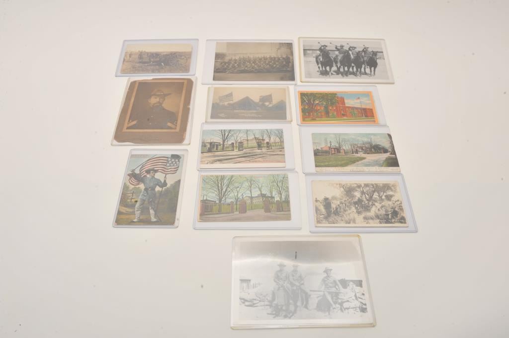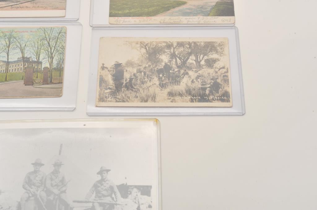 Good lot of military photos and post cards. Cabinet photo in sepia tone of Sarg. on Givens card S.F. image 5 ¼ inch by 3 ½ inch span and era. 2 border war era original photos ID on back. First regimental buglerGeo. E. Walker, Camp Henry James Douglas, Arizona, Second Border patrol outpost, Put’s Caulfield, Urban, Maker troop of 1st cavalry. Photo officers of 36 Inf with 1917 Enfield’s. 8 post cards of forts, Mexico,cannons, 1900-1918. Est;$100-300