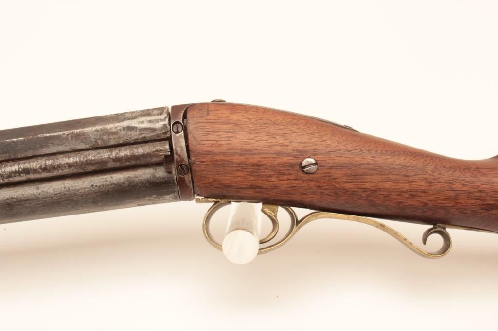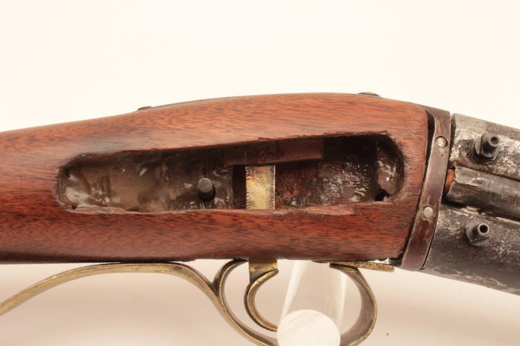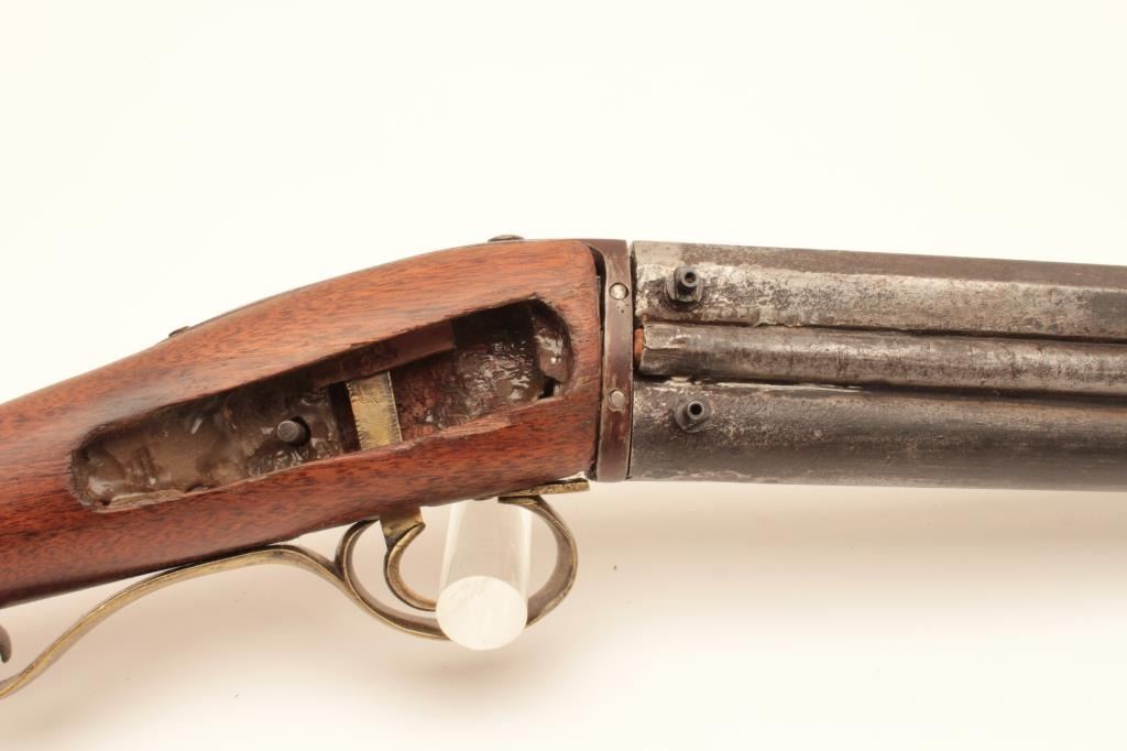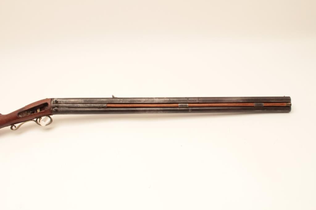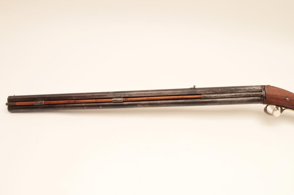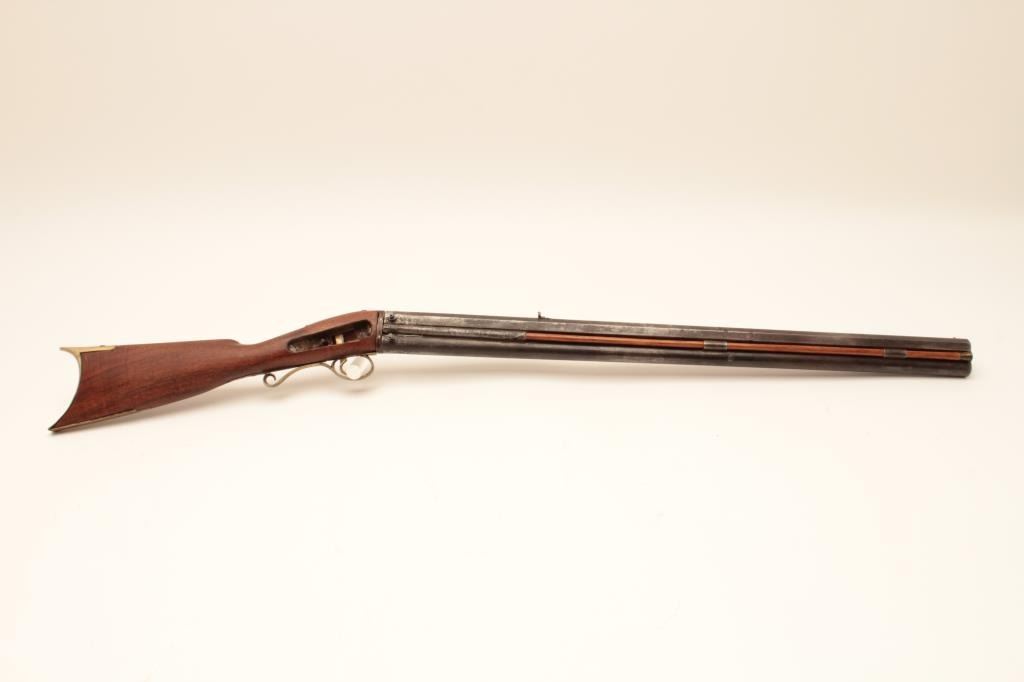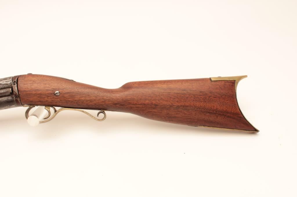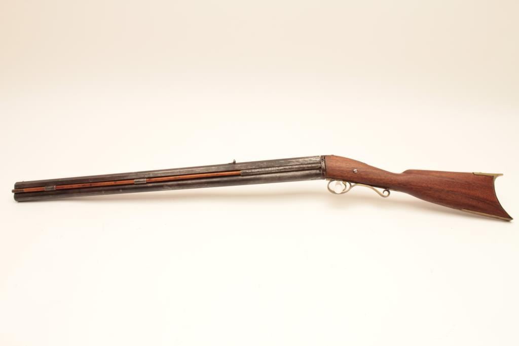 American Over/Under Plains Rifle marked C. Miller, Honeoye N.Y. on barrel. Approx. .45 cal. over 12 ga. Lock originally mule-ear style with w/two hammers is missing. Nipples changed, stock sanded. Cleaning and repairsto tang and breech end of barrels. Est:$175-350