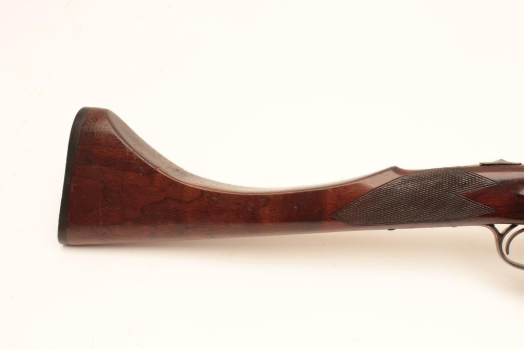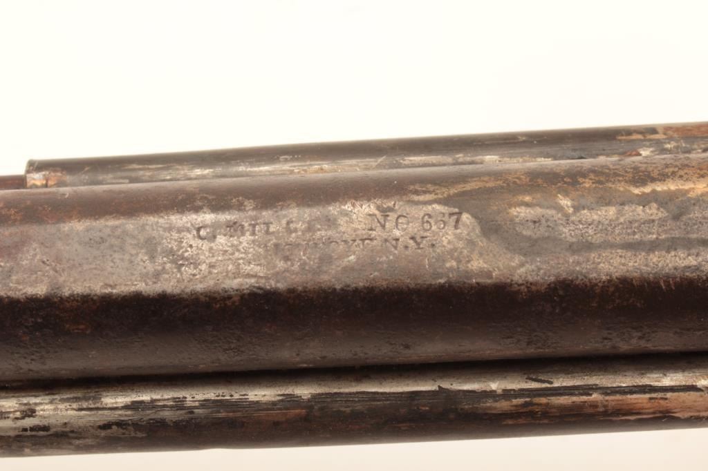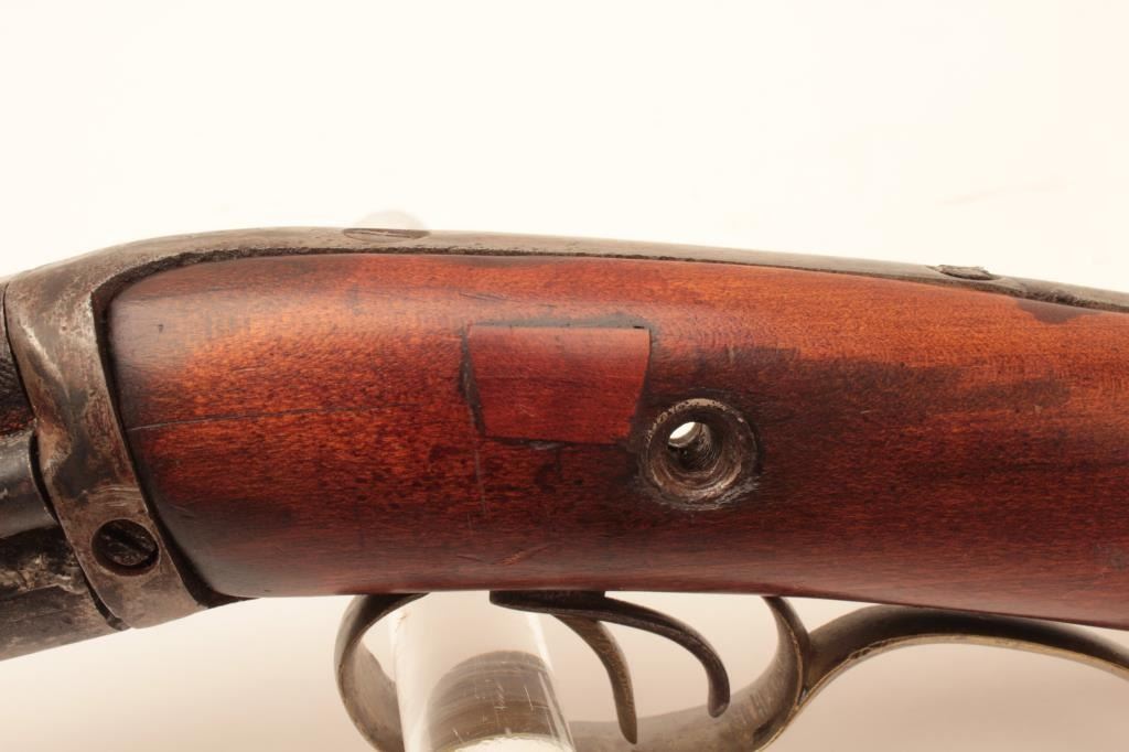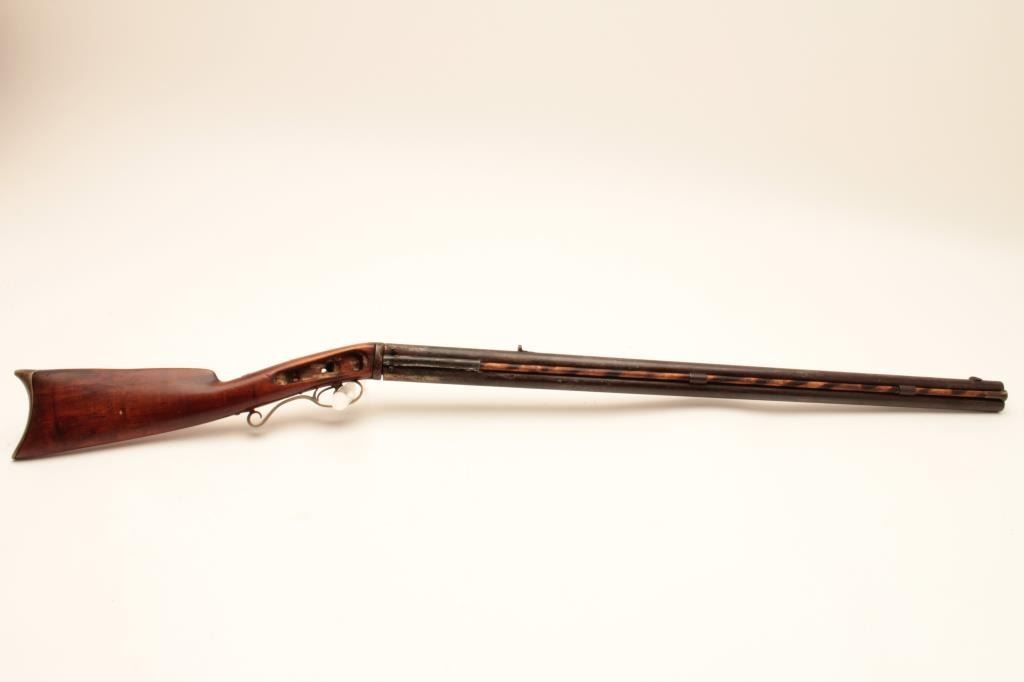American Over/Under Plains Rifle marked C. Miller, Honeoye N.Y. on barrel. Approx. .40 cal. over 16 ga. Lock, originally mule-ear style w/two hammers is massing and nipples changed. Stock sanded. Some cleaning andrepairs to tang, breech area and nipples changed. Est:$175-350
