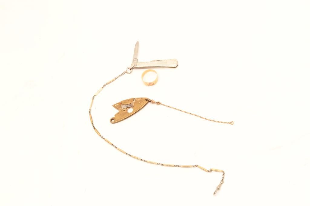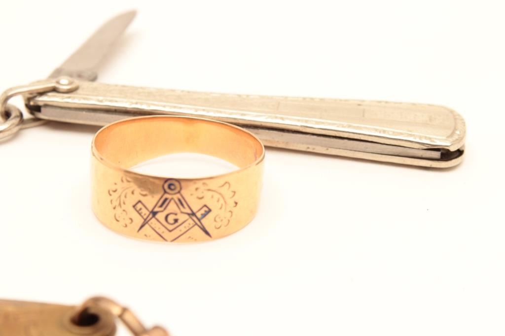 - Lot of Vintage men antique jewelry 1- Watch chain marked with pen knife marked MSR gold-filled. 2- New bachelor marked cigar cutter, brass with plated chain.3- Thin gold 14k marked band with enamel Masonic symbol Est:$150-300