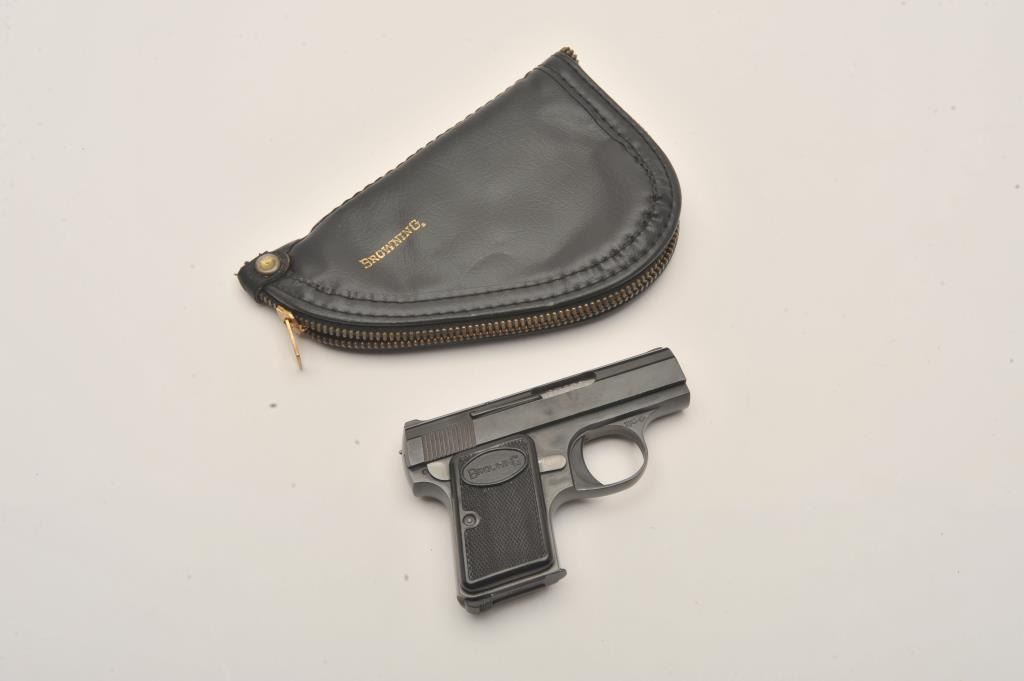 Baby Browning semi-automatic pistol, 6.35mm caliber, 2” barrel, blued finish, checkered black grips, S/N 417977, in overall fine condition with a Browning soft carry case and instructions manual. (C&R/PPT). Est.: $200-$400.