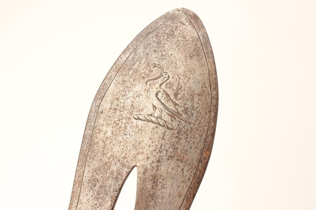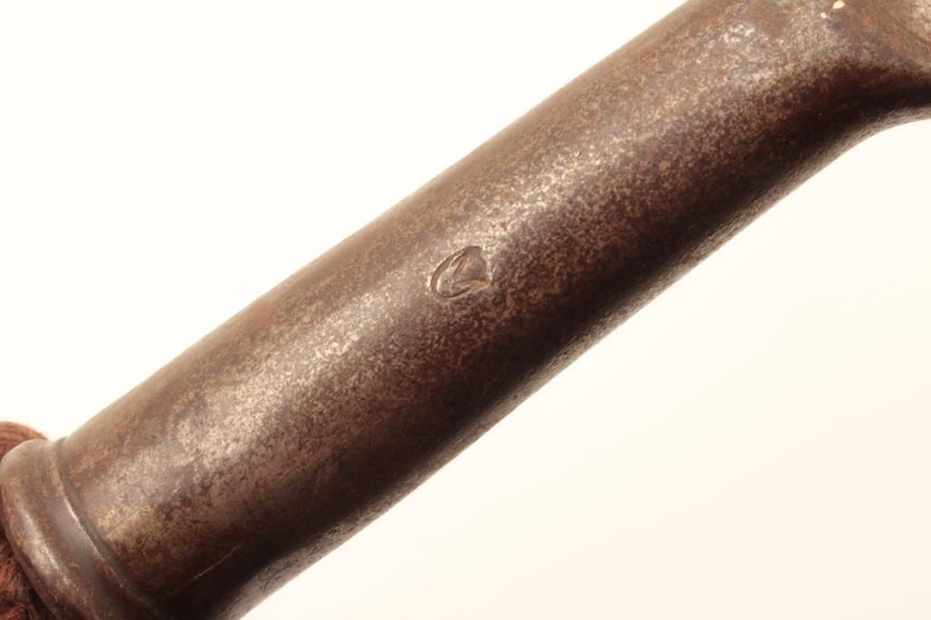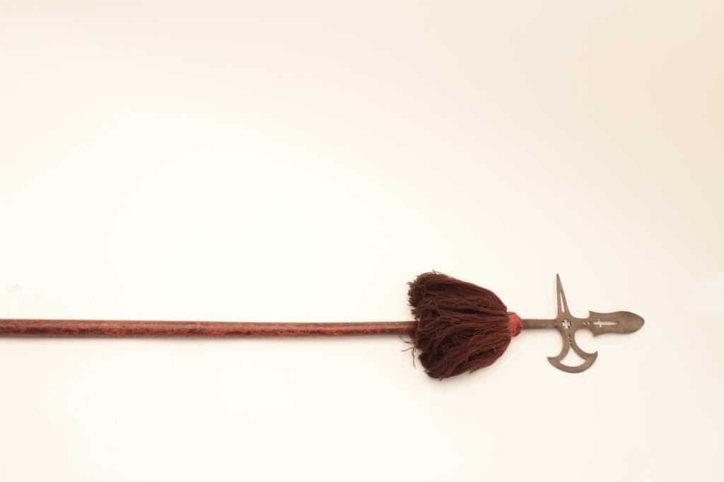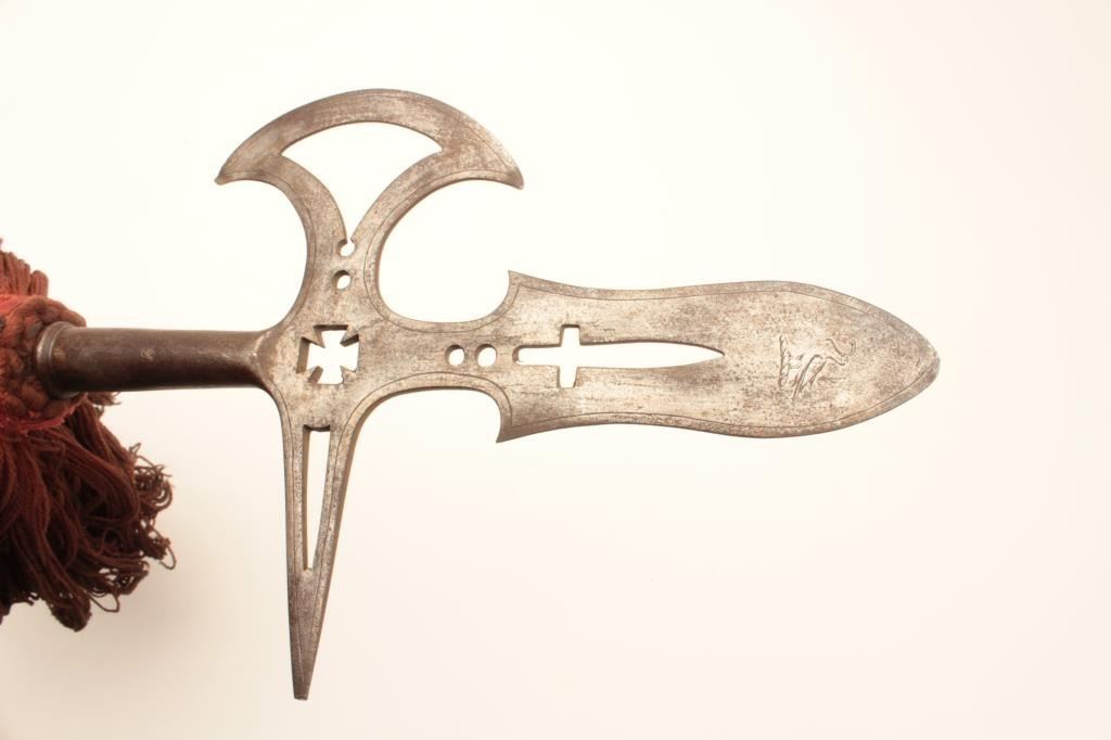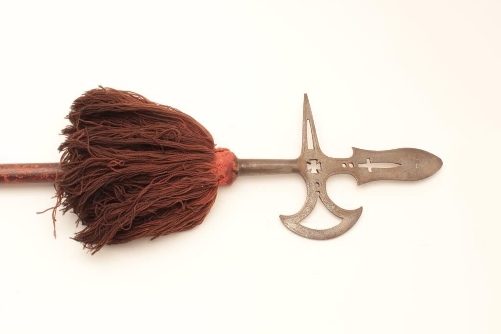 Early Polearm with engraved crest, armorer marked on original pole with fringed mop. Pole measured 4 ½ feet. 17th century to 18th century Italian. Est;$350-700