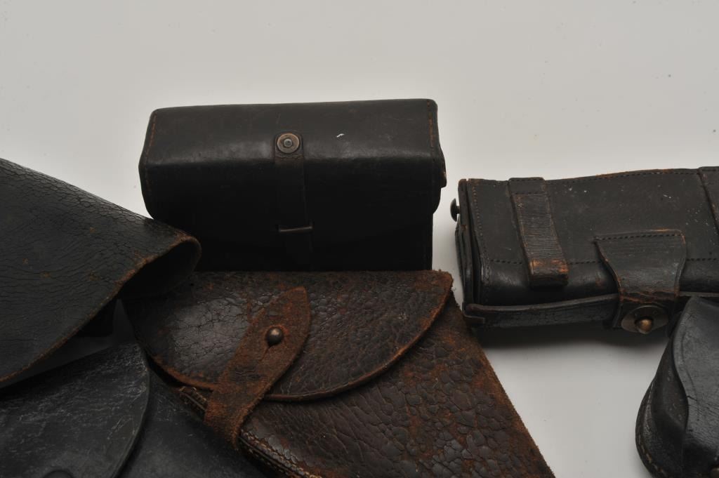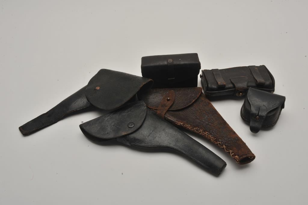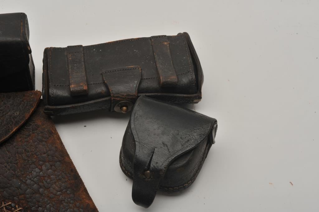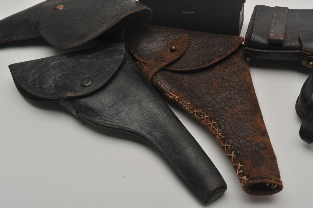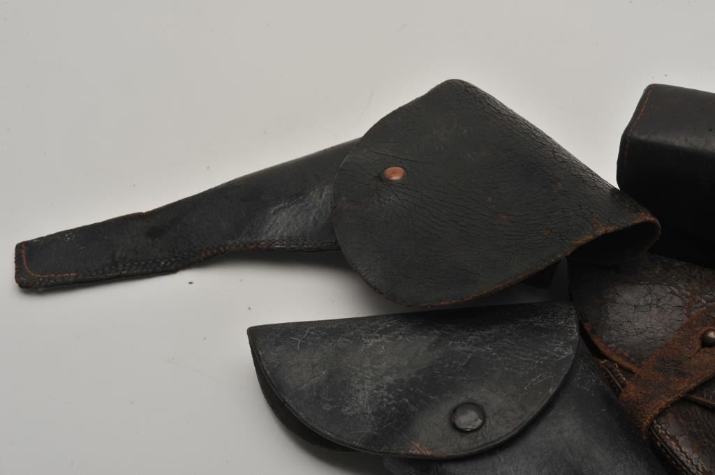 Vintage Leather and Civil war style leather lot. 2 movie pieces probably Gone with the Wind, Bar toolboy cart box US-pour, English lance revolver poor, 22 black flap for 6”revolver, Est:$100-200
