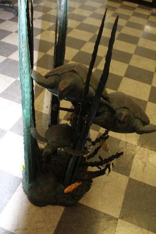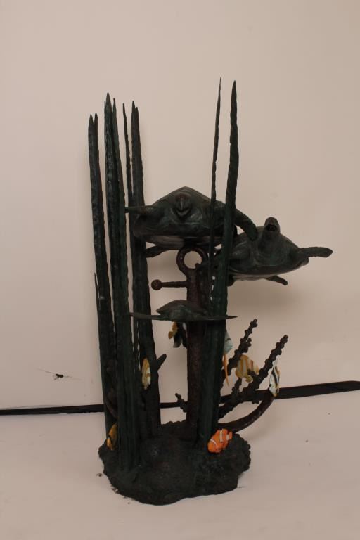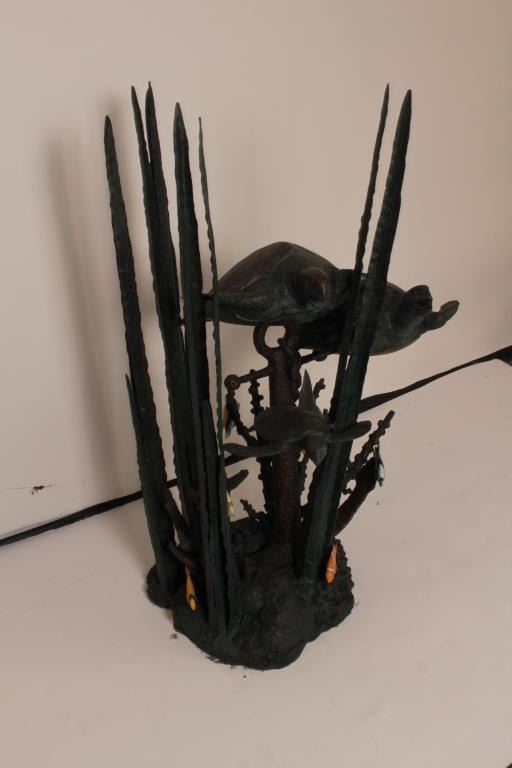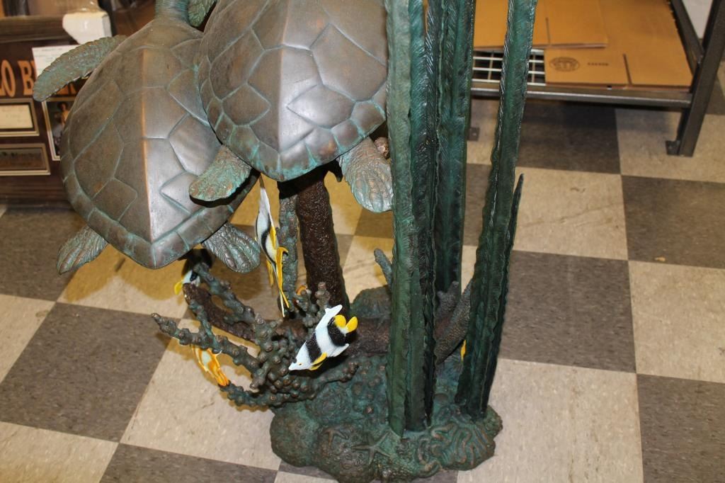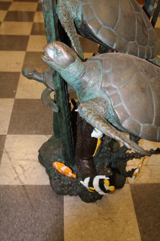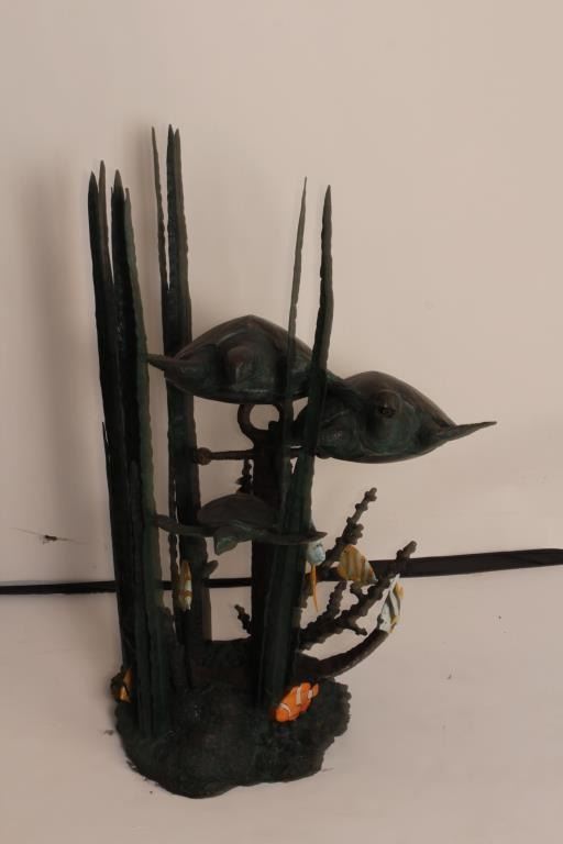 Bronze Sculpture of sea turtles rigged for fountain, Polychrome coloration and bronze patina 43” height by 33”width. A designer piece offered in Dana Point Harbor shop at $4900 on sale, never used. Est:$1500-3000