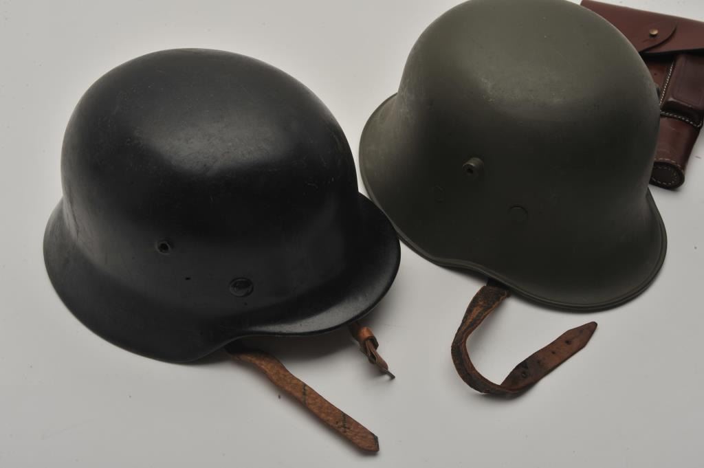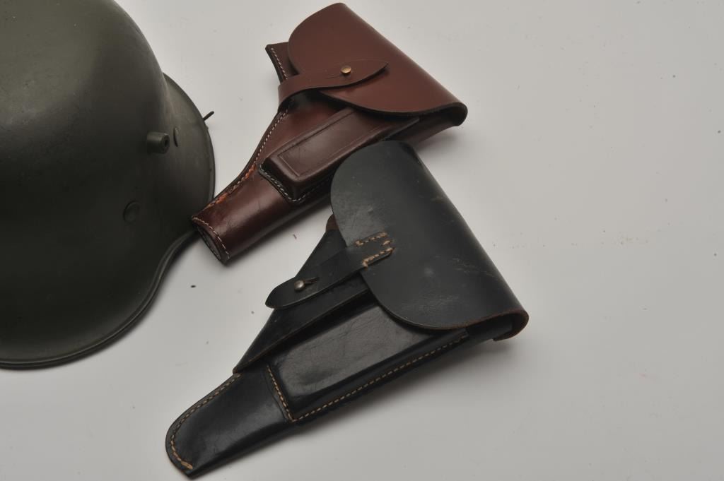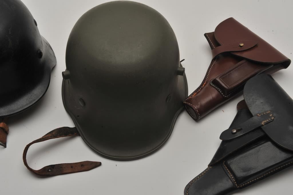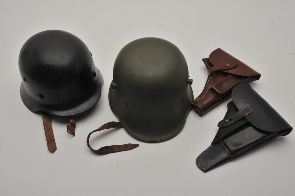 Re-enactor and display lot. 2 reproduction German Helmets and 2 p-38 Holsters, in overall good quality and probably movie props. Est:$150-300