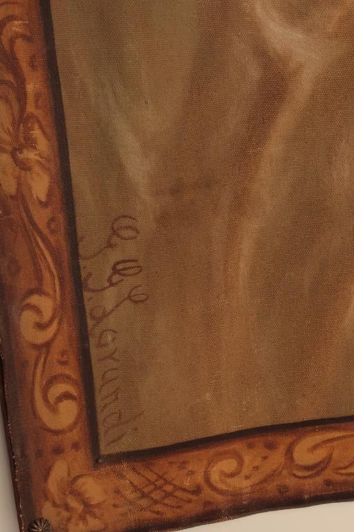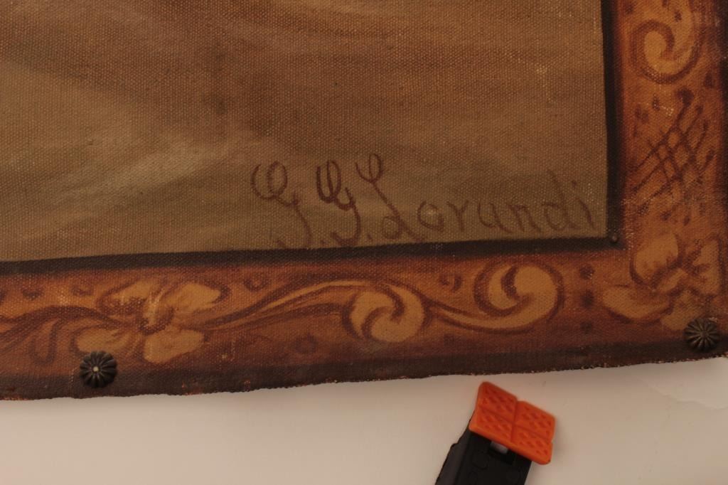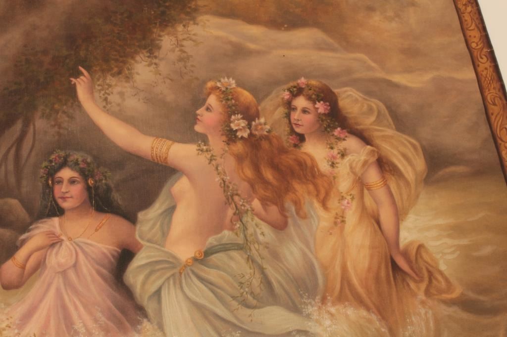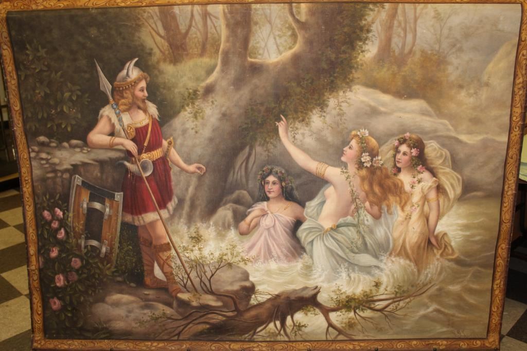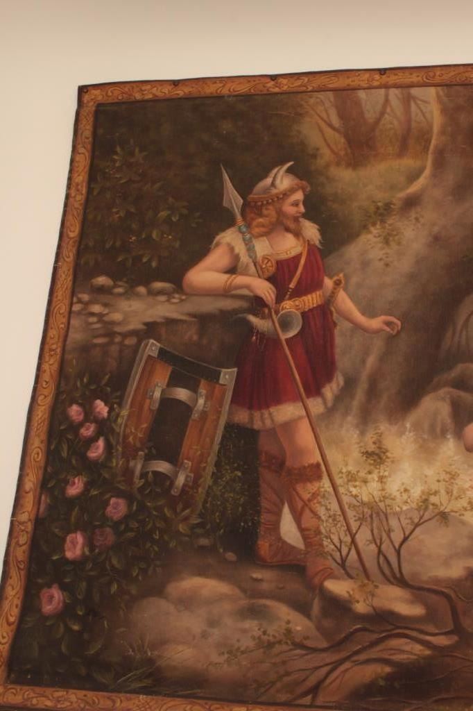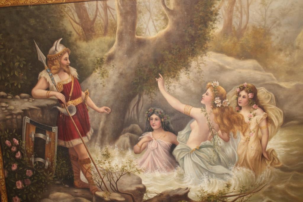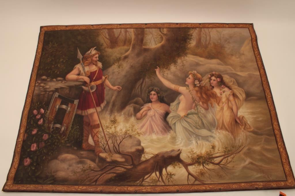 Oil painting on canvas signed lower RT corner G.G. Lorvundi, Scene of Viking god with angelic seminude ladies very tutonic overtones and themes. Fine work, very good condition from major collector estate in Coto De Caza valued at 3500 in appraisal for estate. EST:$500-1000