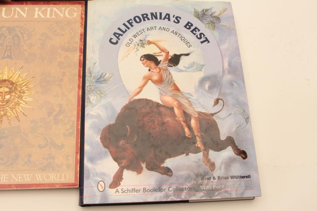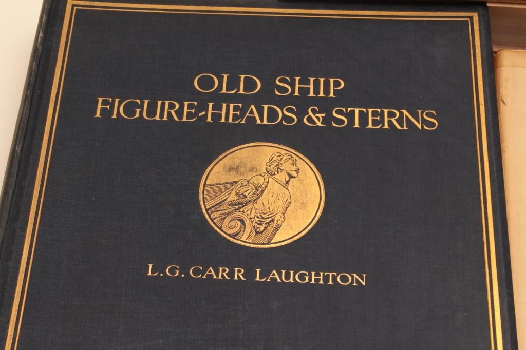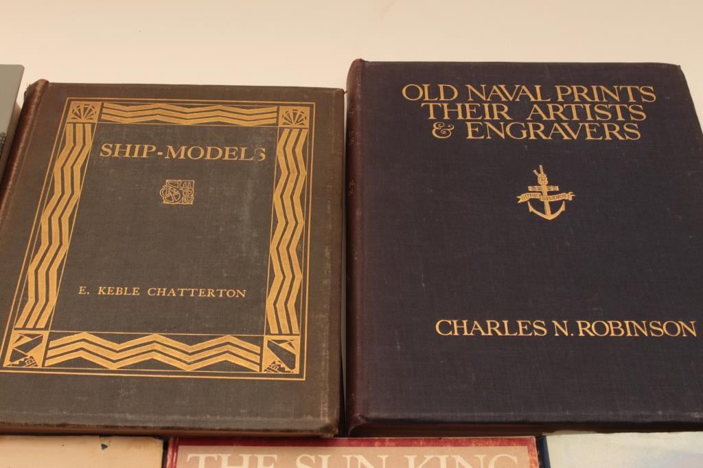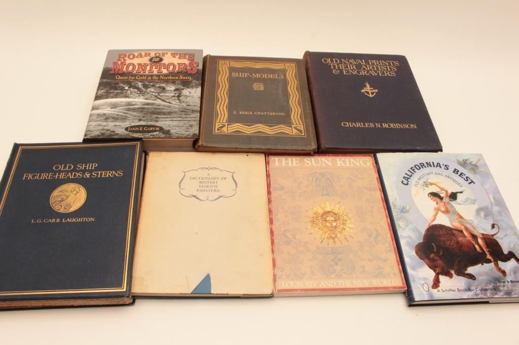 BOOK LOT 1- Old naval prints their artists and engravers by Charles N Robinson 2- Ship models by E Keble Chatterton 3- Roar or the moniters “Quest for Gold inthe northern Sierra” by Jann E Garvis 4- Californias best old west art and antique by Brad and Brian Whiterell 5- The sun king by Louis XIV 6- Old ship figure heads and sterns by LGCarr Laughton 7- A dictionary of British Marine Painters Est:$150-300