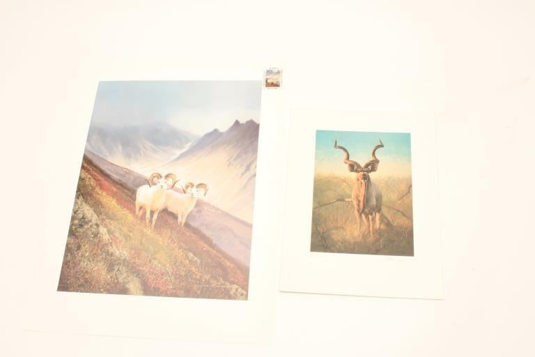 Lot of two color prints, one by noted Western and Wildlife artist Michael Coleman of two mountain goats approximately 23.5” x 18.5”, hand signed and including a 1987/88 Alaska Professional Hunters Association stamp plus a limited edition (825/1500) print of a Greater Kudu by noted Wildlife artist Peter Darro, approximately 15” x 11.5”. Great for the sportsman’s office or den when framed. Est.: $150-$250.