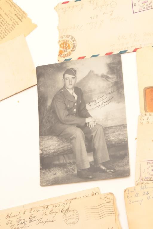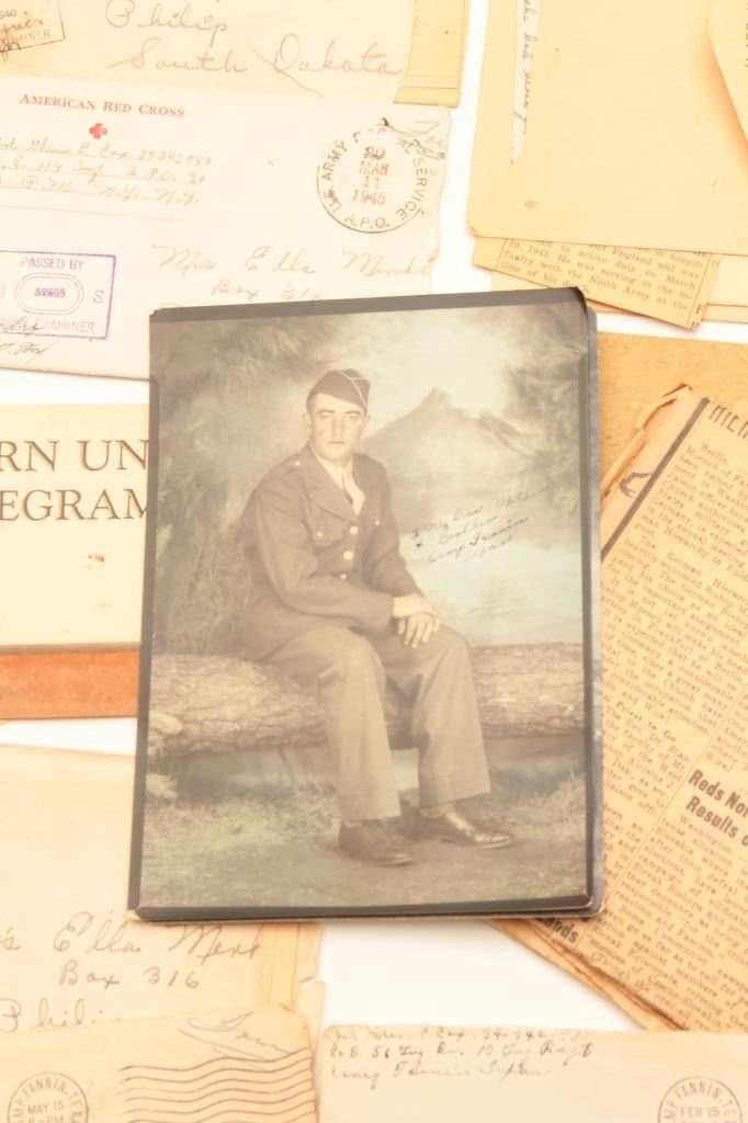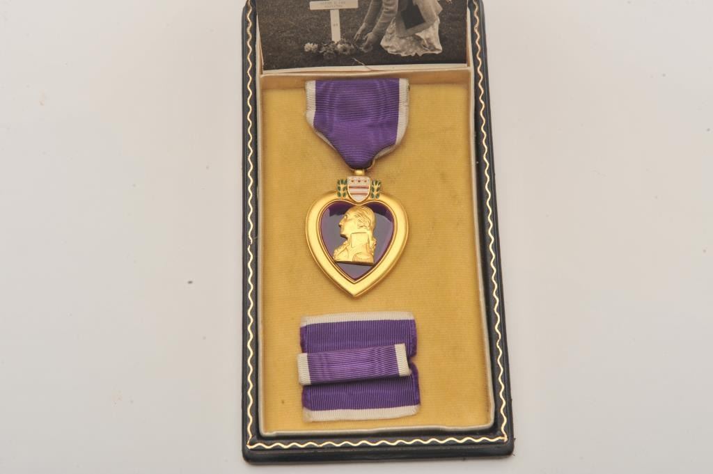 Purple Heart circa WW2 with photos, mail, clippings, telegrams, and announcement of death of commanding officer for Glen E Cok #39342788 KIA Ostrich, Germany March 31, 1945. In SweetHome box which he gave to hismother where it was kept. A great group. Est:$150-300