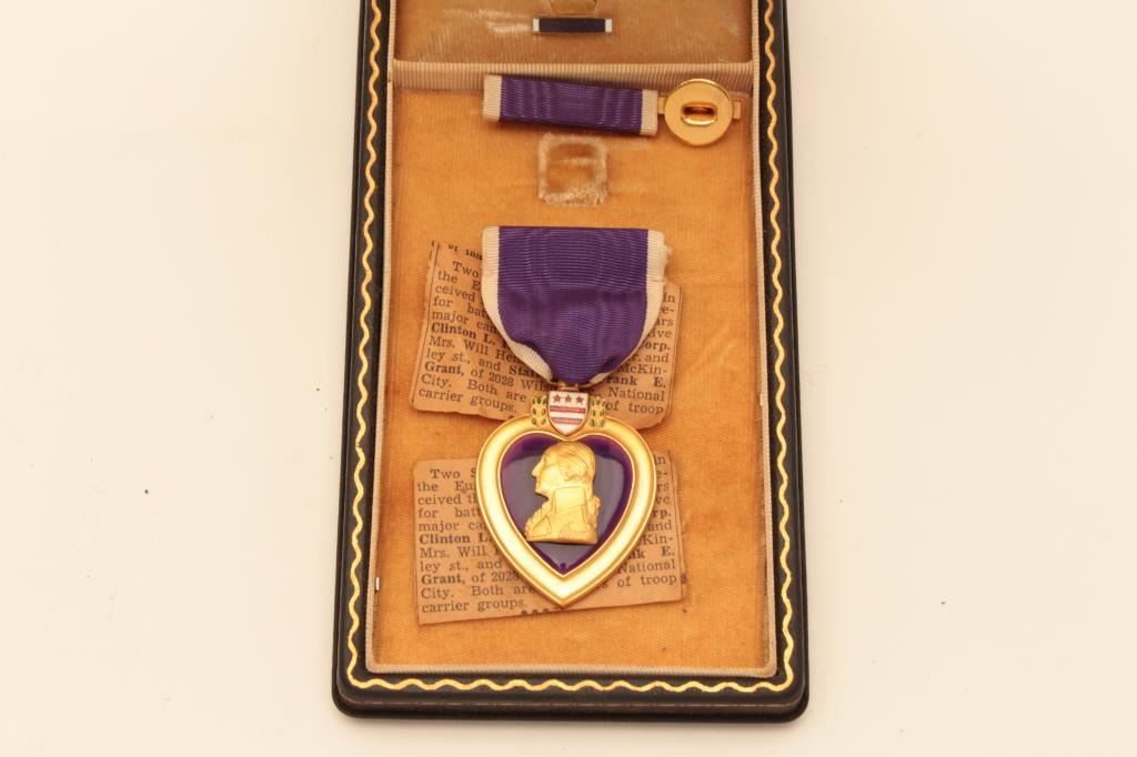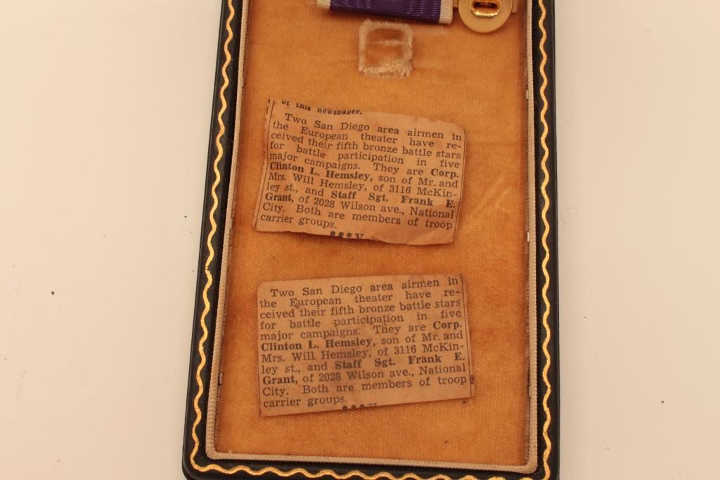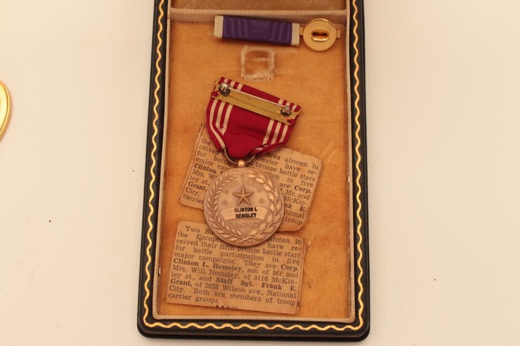WW2 purple heart in case named to Clinton Hemslet with good Conduct Medal, newspaper, clippings Est:$150-300