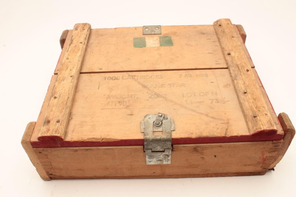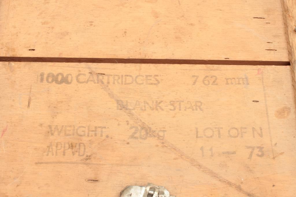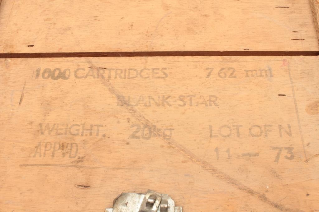 1000 rounds of 308 BLANK cartridges in original wooden crate, blank star, OFN, lot 1-73 marked. Used with m14 for drill, reenactors and ceremonies. Est:$175-300