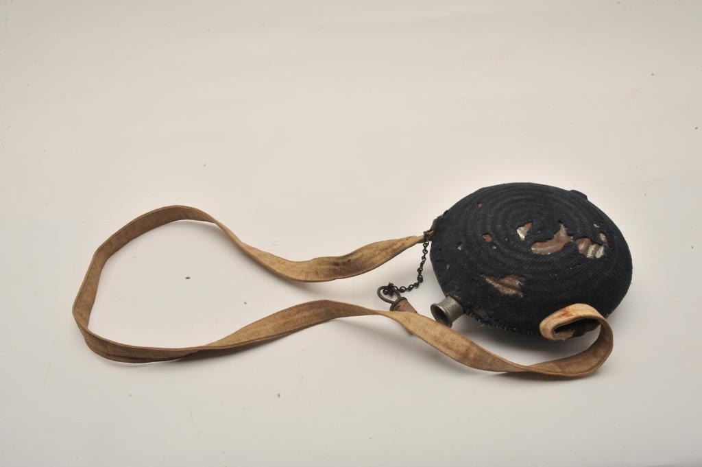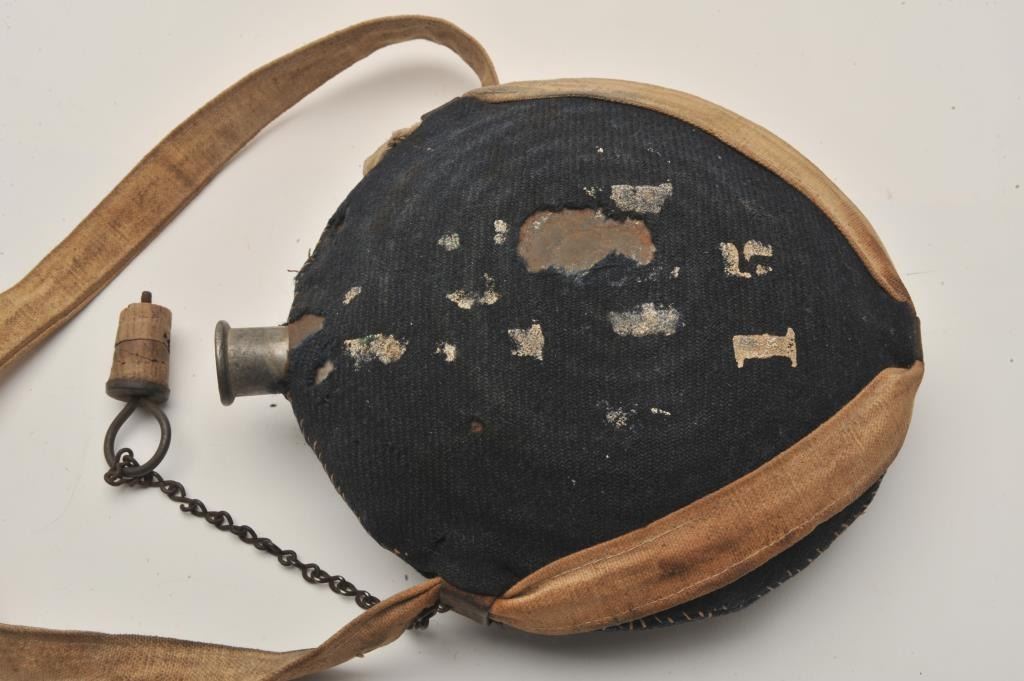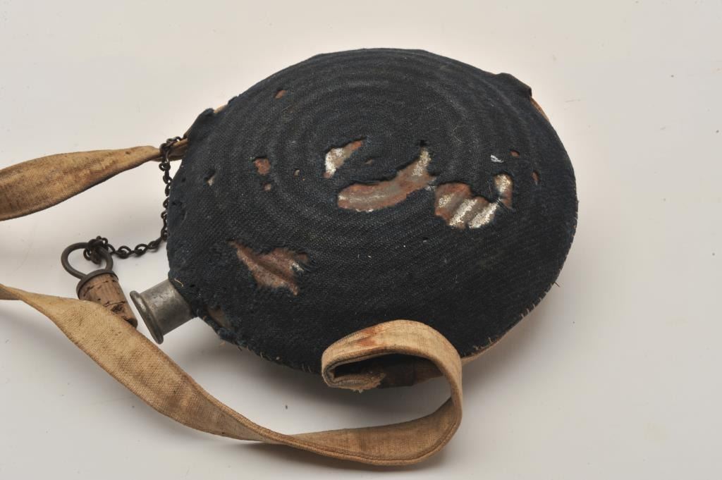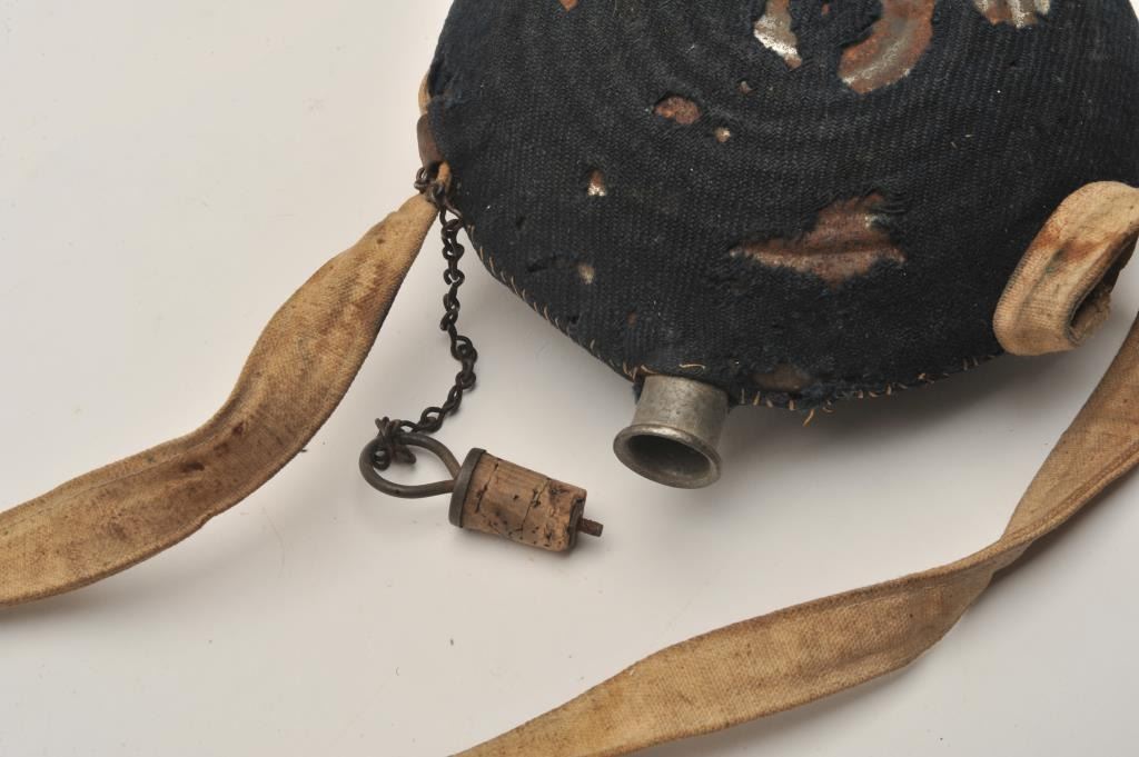 U.S. Model 1858 tin canteen with blue fabric cover and strap, Te cover shows holes and losses with stitched repair. The plug and chain are retained. The strap is a good reproduction. #15 is stenciled on the fabric. Civil War Era. Est.: $150-300